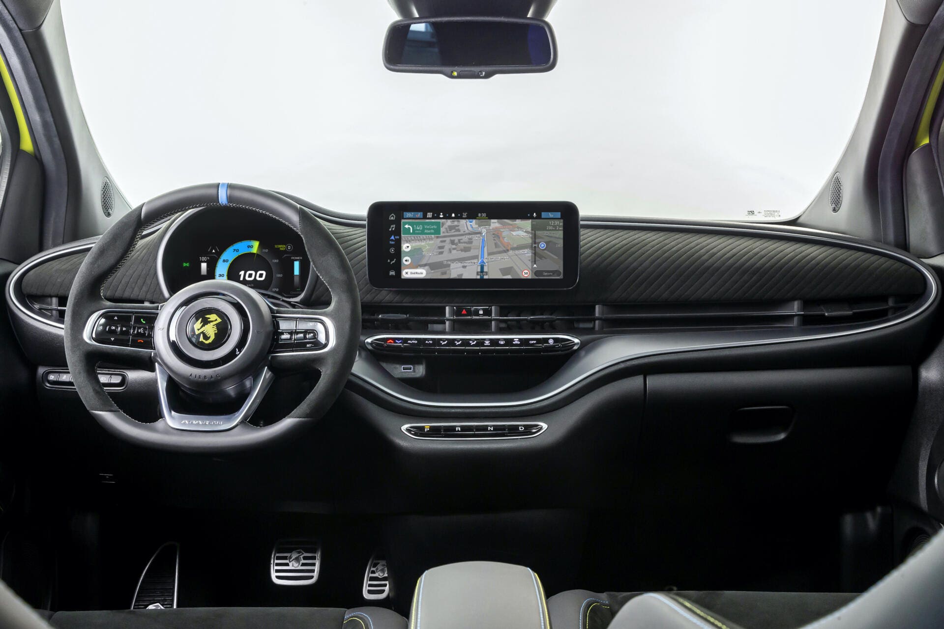 All’interno la plancia rimane quella della Nuova 500 Elettrica sebbene vengano alternati materiali pregiati, come l’Alcantara, agli elementi di design. C’è però un volante sportivo a tre razze tagliato in basso, pedaliera sportiva con logo Abarth e ovviamente anche i sedili sportivi con fascia Poison Blue utile per raggiungere i sedili posteriori.