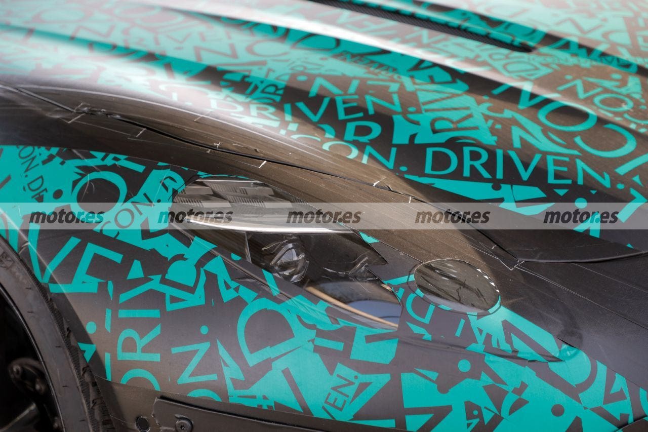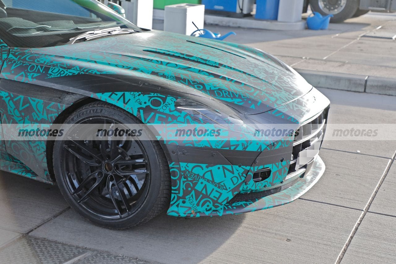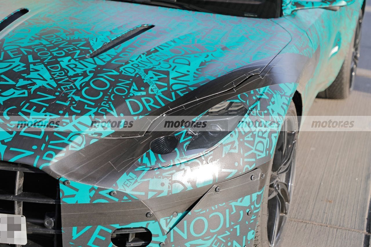 Il pannello del cofano della DB11 si estende dal parabrezza alla griglia intorno ai fari, ma su questo prototipo della futura Aston Martin DB12 ha un aspetto molto diverso, come un classico cofano che termina poco prima dei fari con una griglia del radiatore più alta rispetto alla sezione trasversale anteriore dove troviamo anche una calandra molto più grande, voluminosa e allargata molto generosamente verso le estremità del paraurti anteriore.