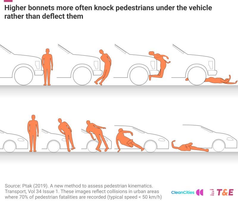 Gli ambientalisti di Transport & Environment invitano gli enti centrali e locali ad agire contro il SUV, e invitano anche le istituzioni internazionali a prendere seri provvedimenti. Nel mirino ci sono le altezze del cofano, che aumentano di 0,5 cm ogni anno. Più l’altezza del cofano supera i 75 cm, più è letale in caso di incidente, a parità di altre condizioni. L’altezza media del cofano – dice T&E – delle auto nuove vendute in Europa nel 2024 è stata di 84 cm, rispetto ai 77 cm del 2010. Dall’articolo: “Così, coloro che camminano o vanno in bicicletta, o vogliono farlo, si trovano ogni anno di fronte a una coorte di nuove auto che hanno una forma più pericolosa. Questi veicoli riducono lo spazio disponibile per i ciclisti (e gli altri veicoli a due ruote) per muoversi in sicurezza accanto a loro e rendono più difficile ottenere un aumento degli spostamenti attivi e i sostanziali benefici per la salute pubblica associati”. Dunque SUV come mine vaganti anti uomo e anti ciclista e anti monopattinista. La guerra fra questi veicoli e gli utenti vulnerabili.