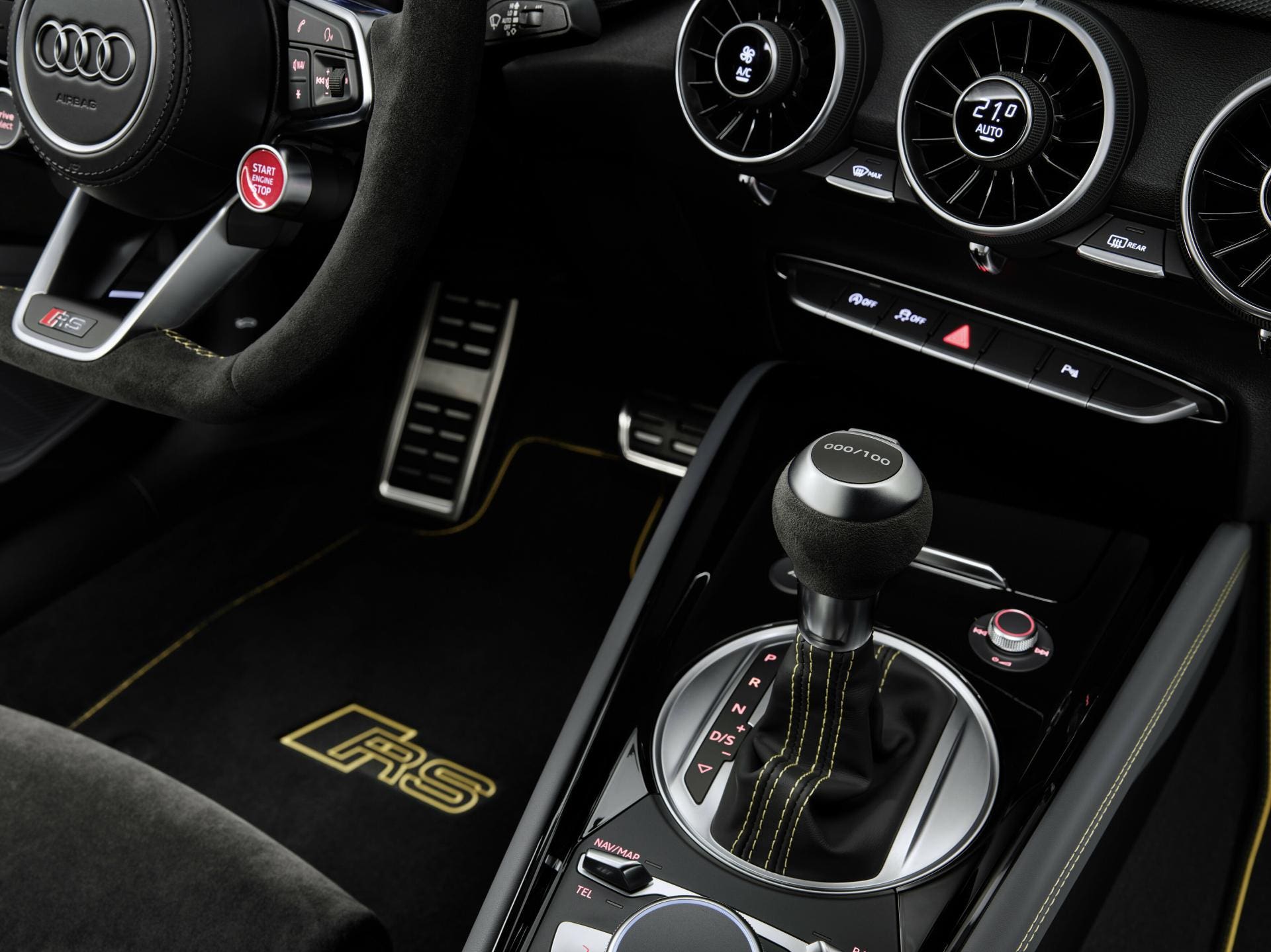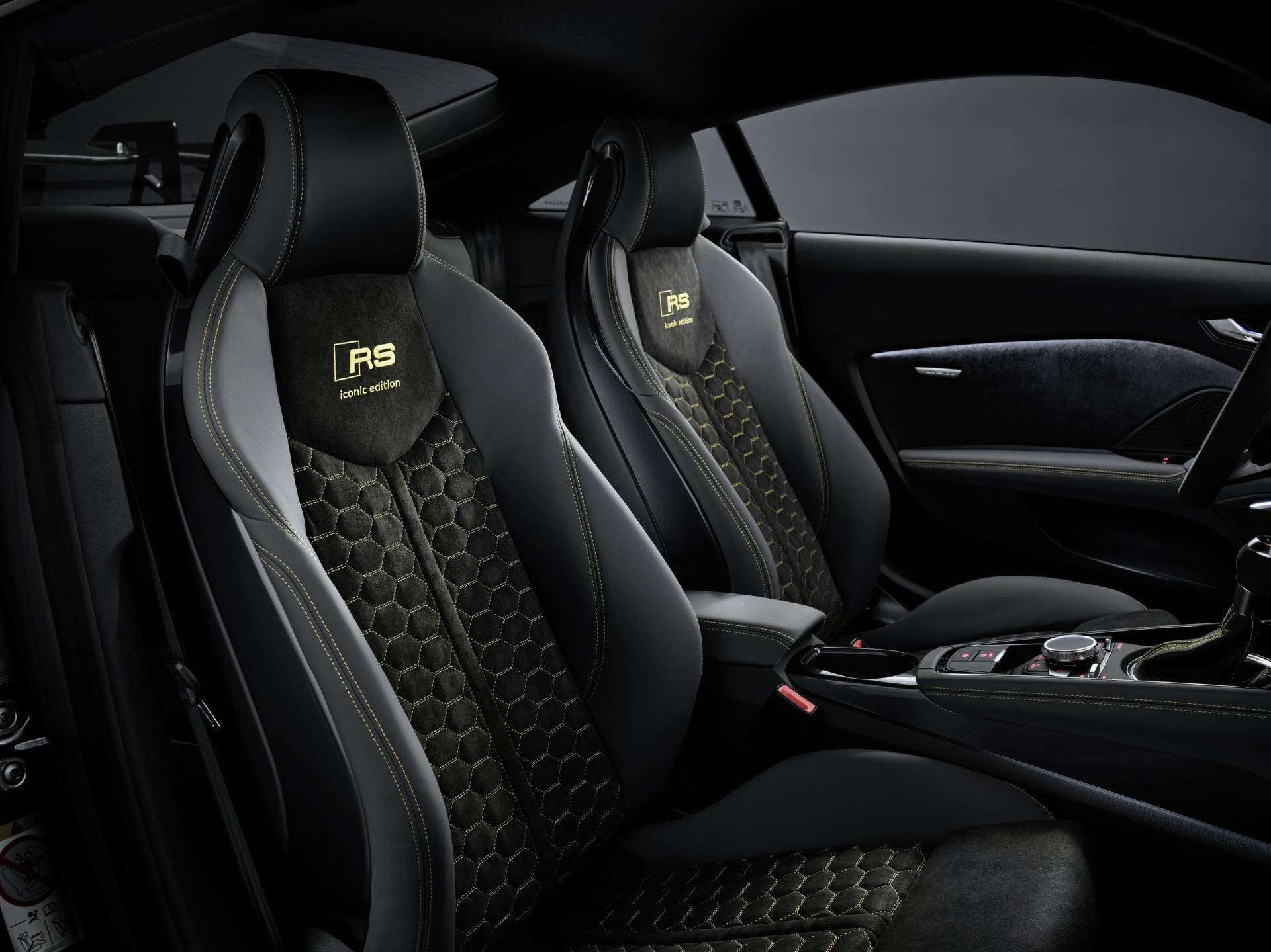Gli interni dell’Audi TT RS Coupé Iconic Edition sono caratterizzati da esclusività e cura dei dettagli. Anche in questo caso, la combinazione di colori scuri degli esterni rimane il motivo centrale, ulteriormente accentuato dall’uso deliberato dall’utilizzo di componenti esclusivi Audi. I sedili sportivi RS sono bicolore con pannelli laterali in pregiata Nappa in grigio jet e pannelli centrali in Alcantara nera, insieme a cuciture a nido d’ape in giallo calendula. L’esclusivo ricamo “Iconic Edition” è incorporato nell’Alcantara nera all’altezza delle spalle. I tappetini neri sono rifiniti con ricamo RS in giallo calendula, mentre il bracciolo delle portiere e la consolle centrale sono anch’essi in grigio jet e decorati con cuciture a contrasto in giallo calendula, proprio come la carenatura nera dell’Audi Virtual Cockpit. I clienti cercano Alcantara nera sui pannelli delle portiere e il volante sportivo RS in pelle con marcatura gialla calendula a ore 12. È tutta una questione di individualità sulla leva selettrice: il badge numerato rende unico ciascuno dei 100 veicoli previsti per questa edizione speciale.