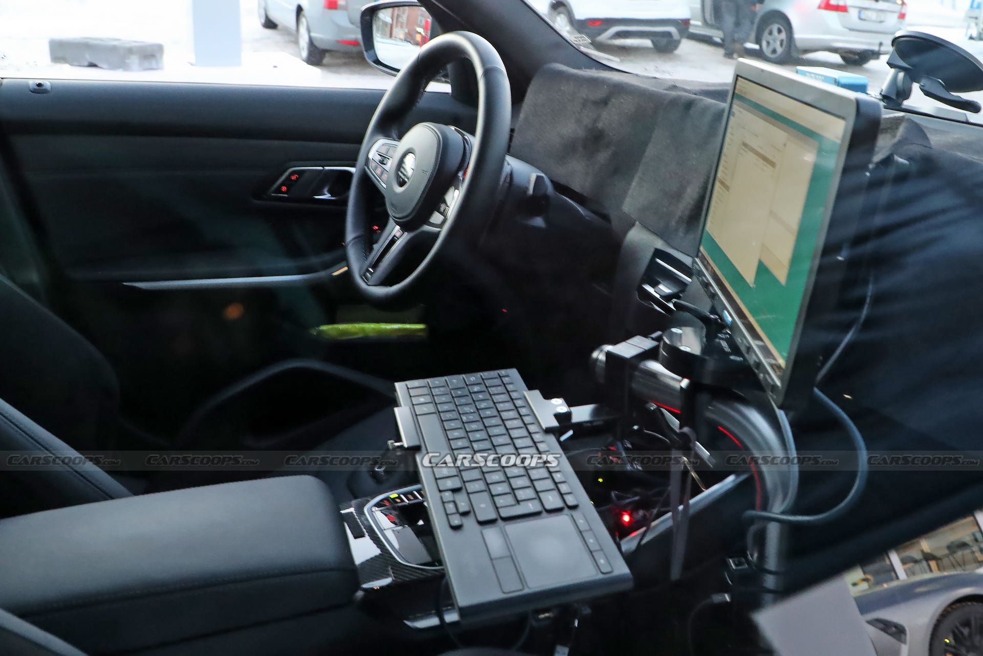 Interessante anche un’immagine relativa all’interno dell’auto. Mentre l’abitacolo è caratterizzato dalla diffusa presenza di apparecchiature di prova, possiamo vedere che questa BMW M3 Touring presenta lo stesso quadro strumenti digitale e la stessa configurazione dello schermo dell’infotainment della i4 completamente elettrica. In confronto, le M3 ed M4 standard hanno un quadro strumenti digitale leggermente più tradizionale con una grande copertura e uno schermo destinato all’infotainment separato a fianco. L’imminente restyling di mezza età dell’intera gamma della Serie 3 e della Serie 4 dovrebbe migrare verso il layout dell’abitacolo più moderno proposto dalla i4, che presenta anche l’ultimo sistema di infotainment di casa BMW.