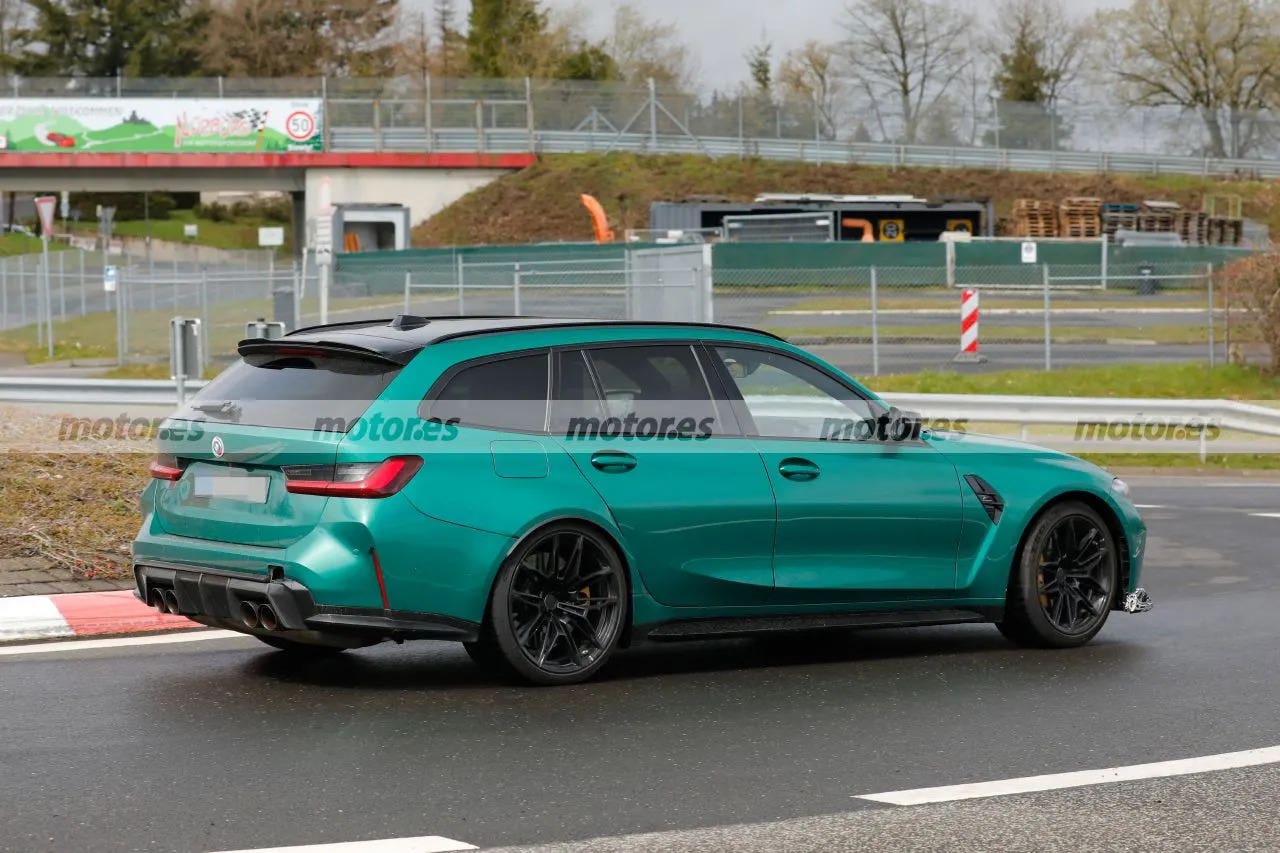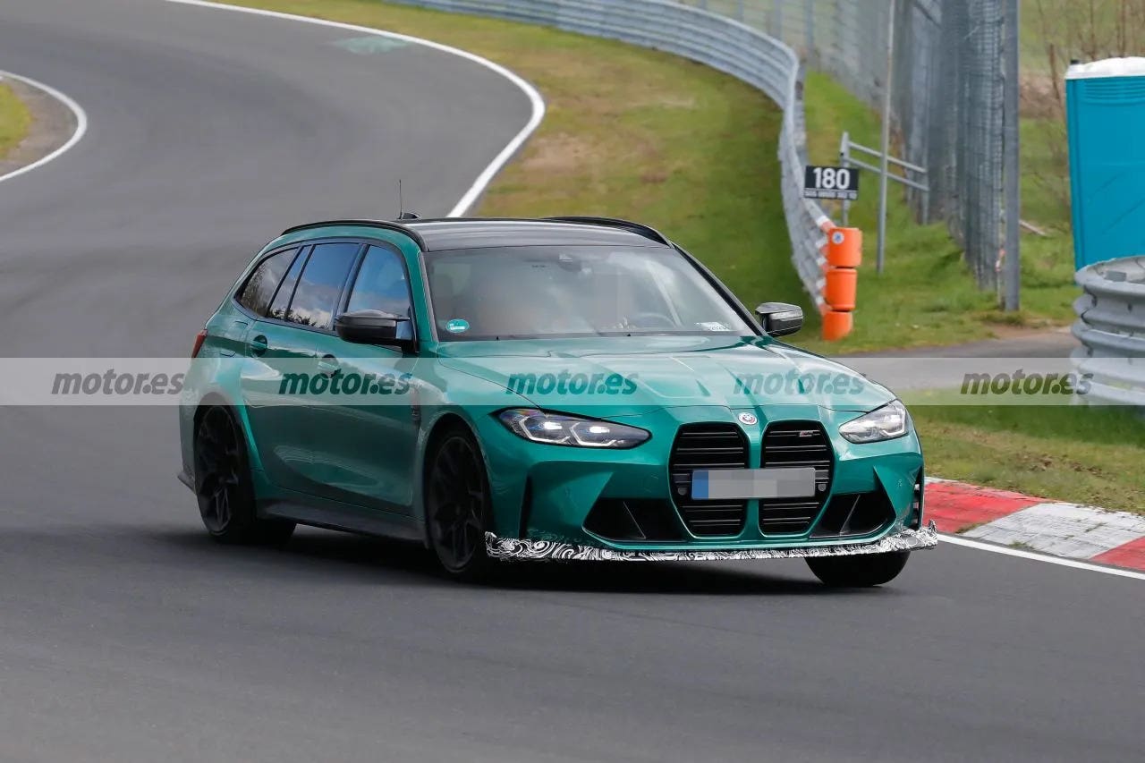 BMW ha cominciato molto presto con la nuova stagione di test sul circuito tedesco del Nürburgring. La divisione più sportiva del marchio si è spostata sul tracciato tedesco con un muletto di prova particolarmente appariscente della nuova BMW M3 Touring. Queste interessanti foto spia mostrano che il costruttore tedesco sta preparando una versione più radicale di questa familiare sportiva di nuova generazione.