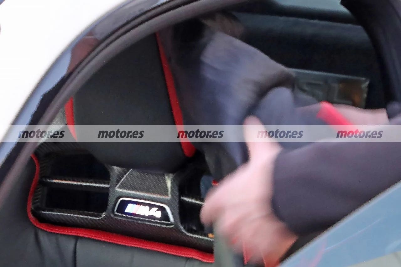 La BMW M4 CSL è dotata di cerchi in lega forgiata e di un potente impianto frenante con dischi carbo-ceramici, come dimostrano le enormi pinze gialle a disposizione. Sul posteriore, i fanali hanno la stessa forma ma la grafica luminosa e qualche altro elemento specifico saranno diversi da quelli a disposizione sulla M4 “standard”, così come il paraurti e gli scarichi di diametro maggiore. Nel mezzo, è previsto un nuovo diffusore con luce di stop integrata nel più puro stile da Formula 1. Ma se l’esterno è importante, le immagini dell’interno sono più interessanti, poiché confermano chiaramente alcune indiscrezioni.