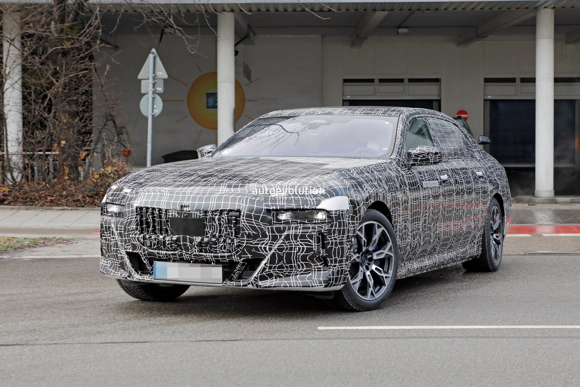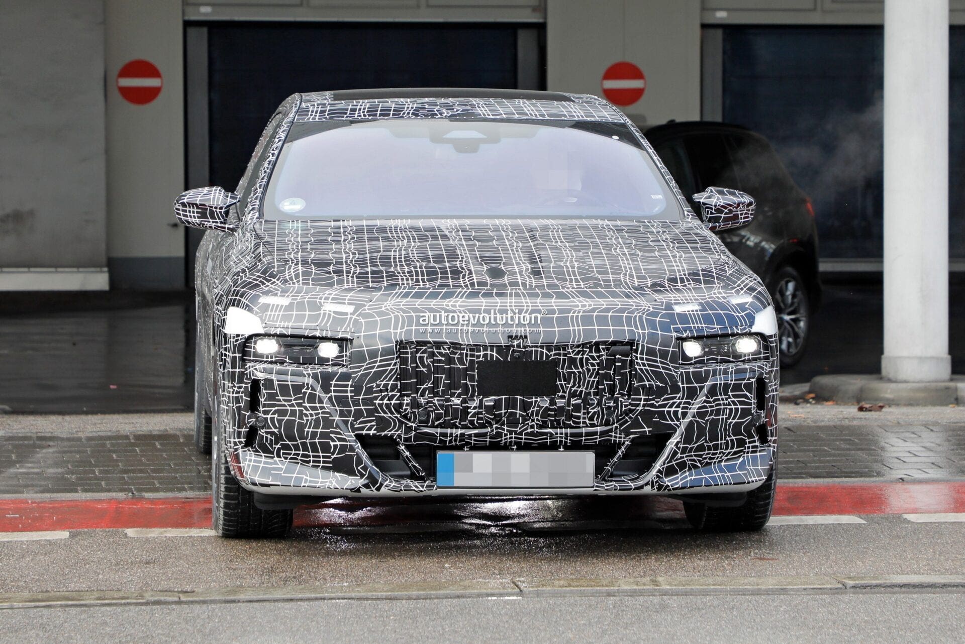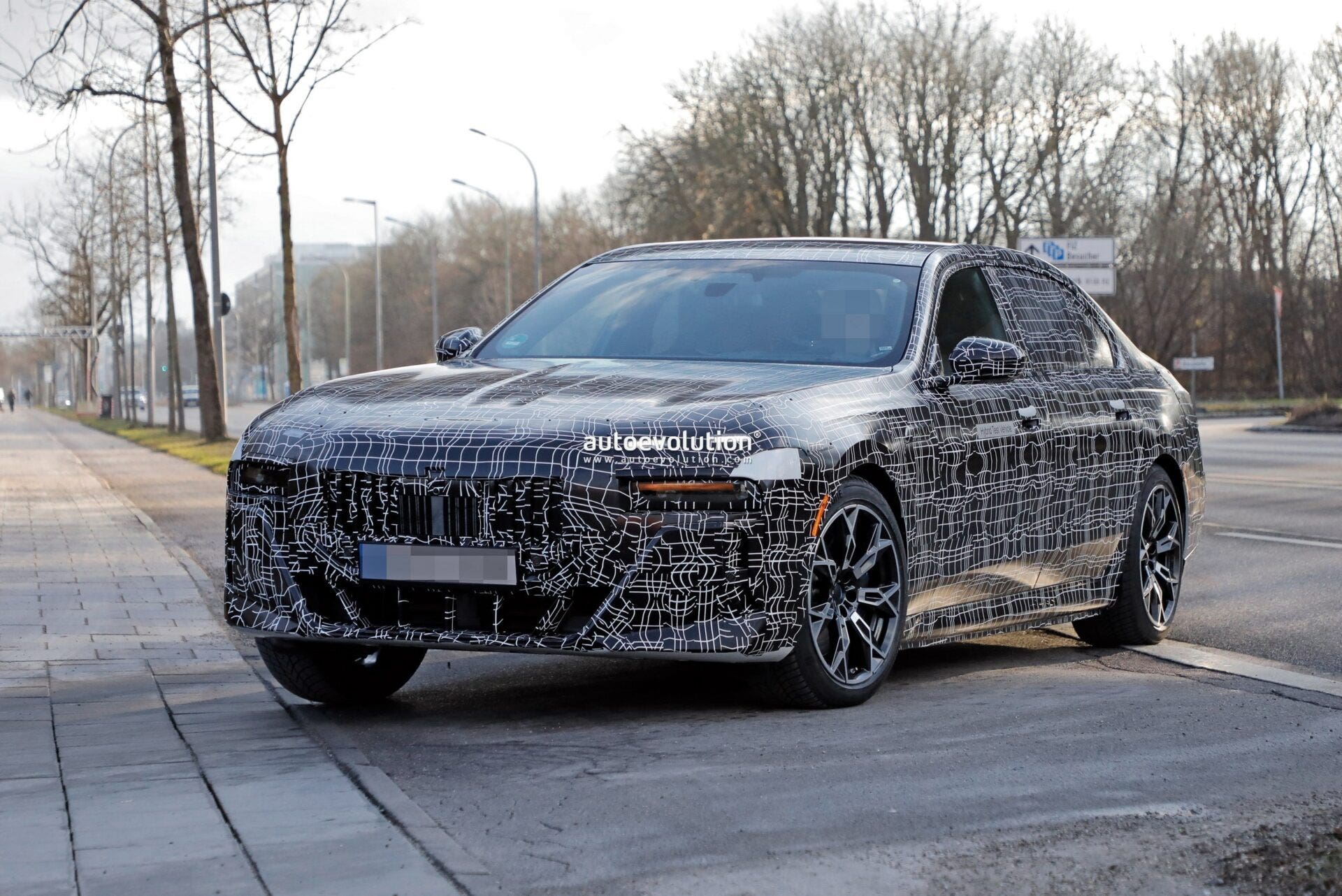 Le pinze dei freni blu, tipiche del pacchetto sportivo, sono ora più visibili su entrambi gli assi mentre è più evidente il design del paraurti anteriore di questa futura BMW Serie 7. La parte inferiore, dotata di una grande presa d’aria a forma di trapezio rovesciato, è divisa in sezioni e con ulteriori sottili branchie verticali alle estremità del parafango. Uno stile più aggressivo per un design all’avanguardia che caratterizzerà questa nuova BMW Serie 7 G70.
