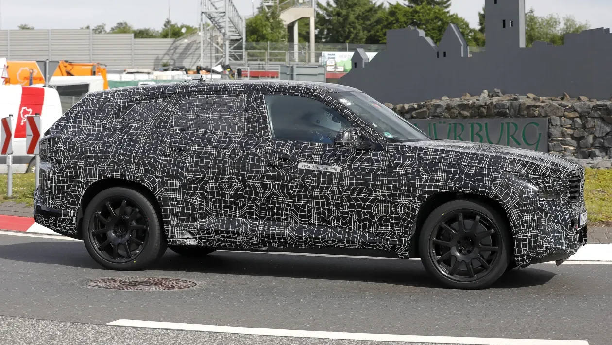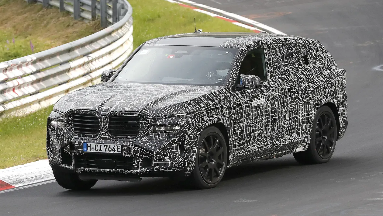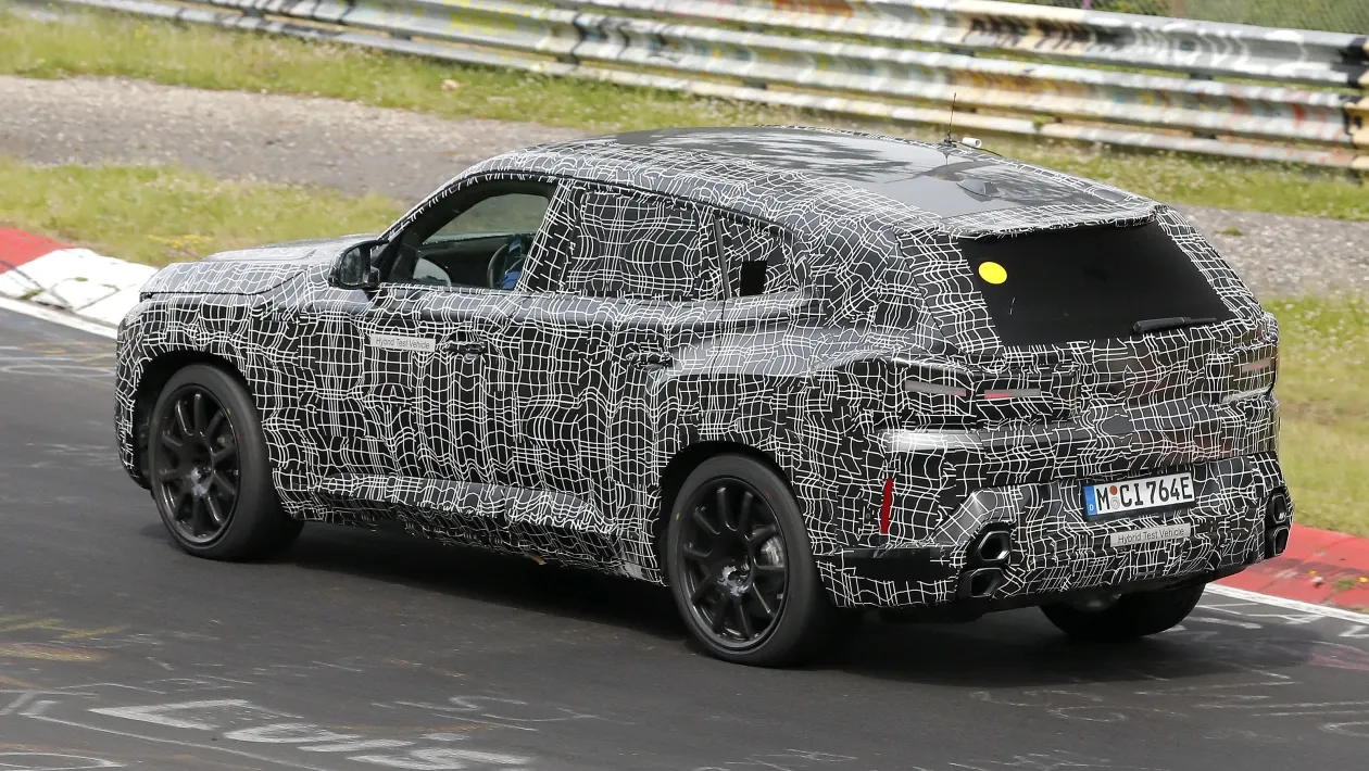 A giudicare da queste foto spia, l’auto di serie dovrebbe risultare molto simile alla Concept XM che è stata rivelata alla fine dell’anno scorso. Presenta in anteprima il linguaggio stilistico “progressista” di nuova generazione di BMW per i suoi modelli di lusso, con le griglie del Doppio Rene sovradimensionate, proprio come nel caso della nuova Serie 7, sebbene qui siano presenti barre orizzontali piuttosto che verticali. Simile al concept, le pieghe pesanti scorrono indietro dalla griglia sul cofano alto per dargli un avantreno più aggressivo. La griglia stessa, su questa BMW XM, è affiancata da una coppia di gruppi ottici ultrasottili che sono stati suddivisi in due moduli separati su ciascun lato, con un paraurti angolare più in basso. I passaruota squadrati rivestiti in plastica conferiscono alla XM un aspetto robusto, mentre l’altezza del tetto è bassa e le finestrature ridotte conferiscono a questo nuovo SUV di alto livello alcune proporzioni sportive. Le ruote montate su questa vettura di prova probabilmente non saranno presenti sull’auto di produzione, che è già stata confermata con pneumatici da 22 pollici come standard e da 23 pollici come optional.