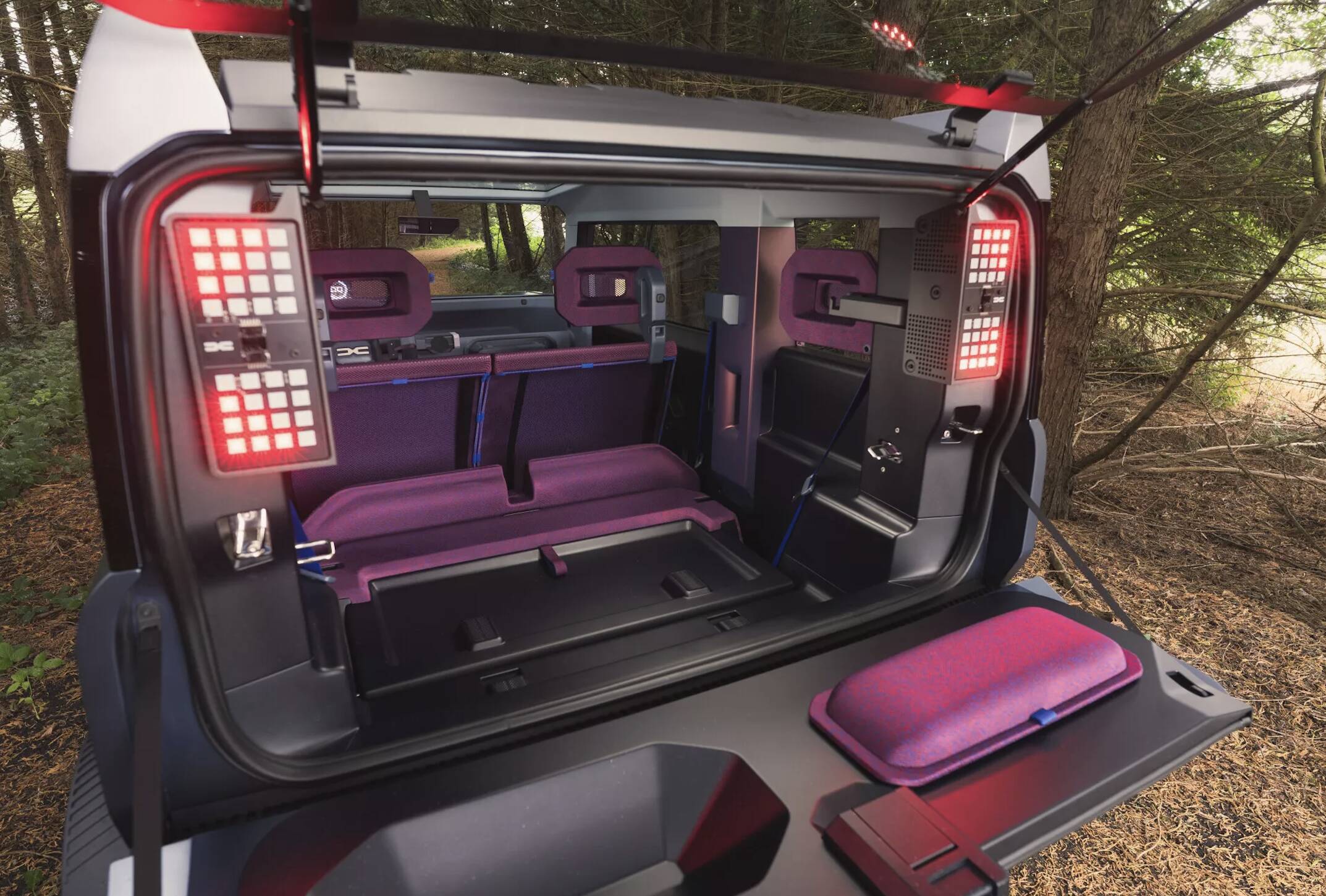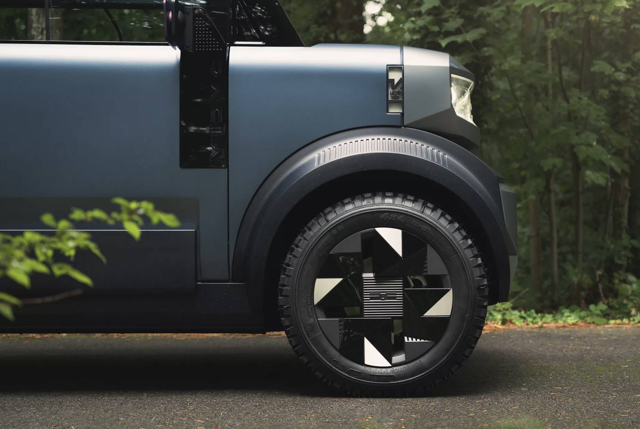 Abbiamo 3 metri di lunghezza, 1,53 metri di altezza e 1,55 metri di larghezza: 4 posti e un bagagliaio modulabile da 70 a 500 litri. Con le ruote posizionate ai quattro angoli per sbalzi quasi azzerati. Il muso ha una fascia trasparente orizzontale che integra i gruppi ottici. Il lunotto a tutta larghezza si apre indipendentemente dal portellone a ribaltina. Un piccolo oggetto che pare una micro SUV, un Hummer (foto giù) compresso, con forme ultra squadrate.