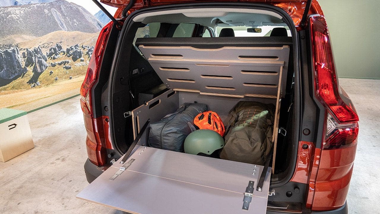 Dacia ha confermato che il modulo per camperizzare il Jogger sarà disponibile nel 2023 e potrà essere installato in pochi minuti. La ragione? Non necessita di una particolare installazione in quanto si tratta di un box in legno che, come si può vedere, si inserisce nel bagagliaio e permette di godere di uno spazio di stivaggio di 220 litri mentre la parte superiore può essere trasformata in un letto utile per due persone.