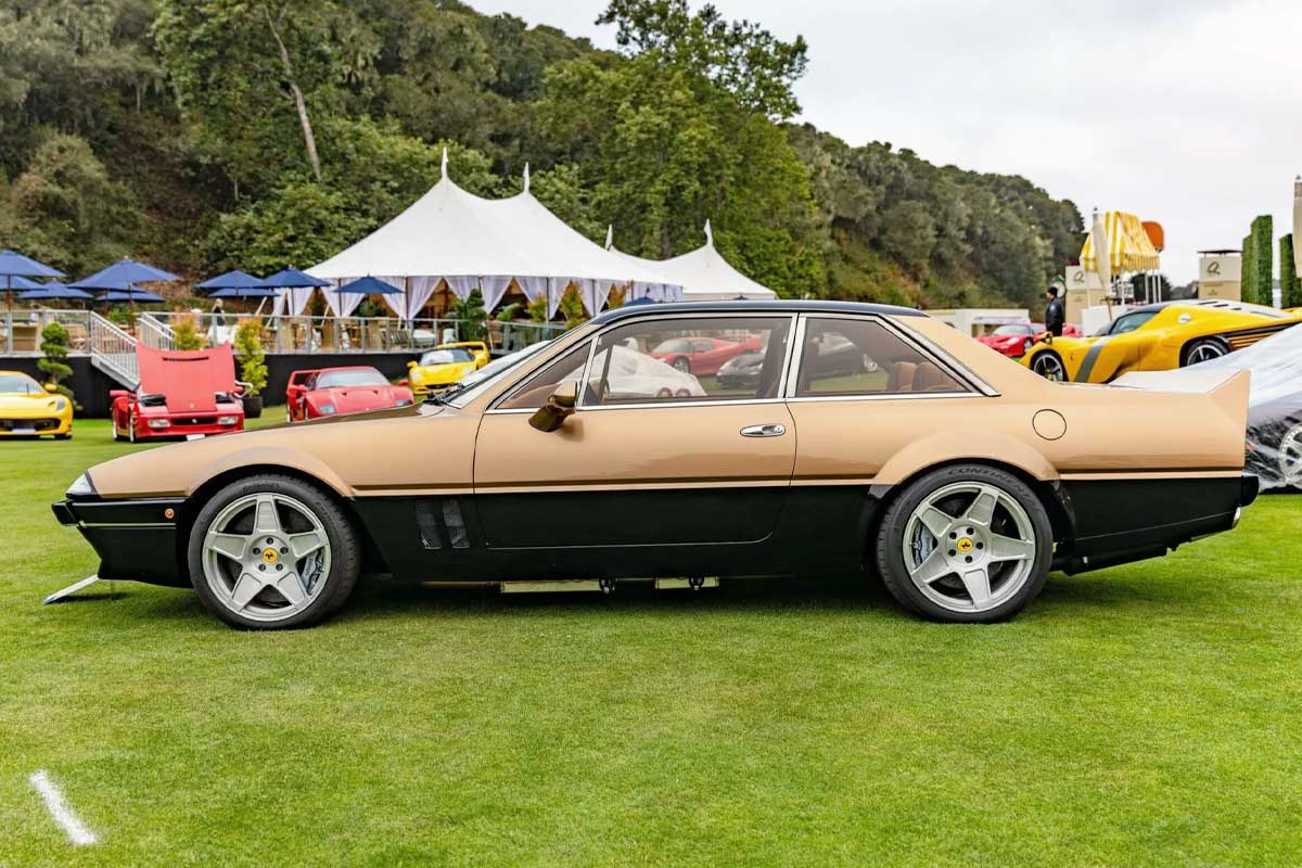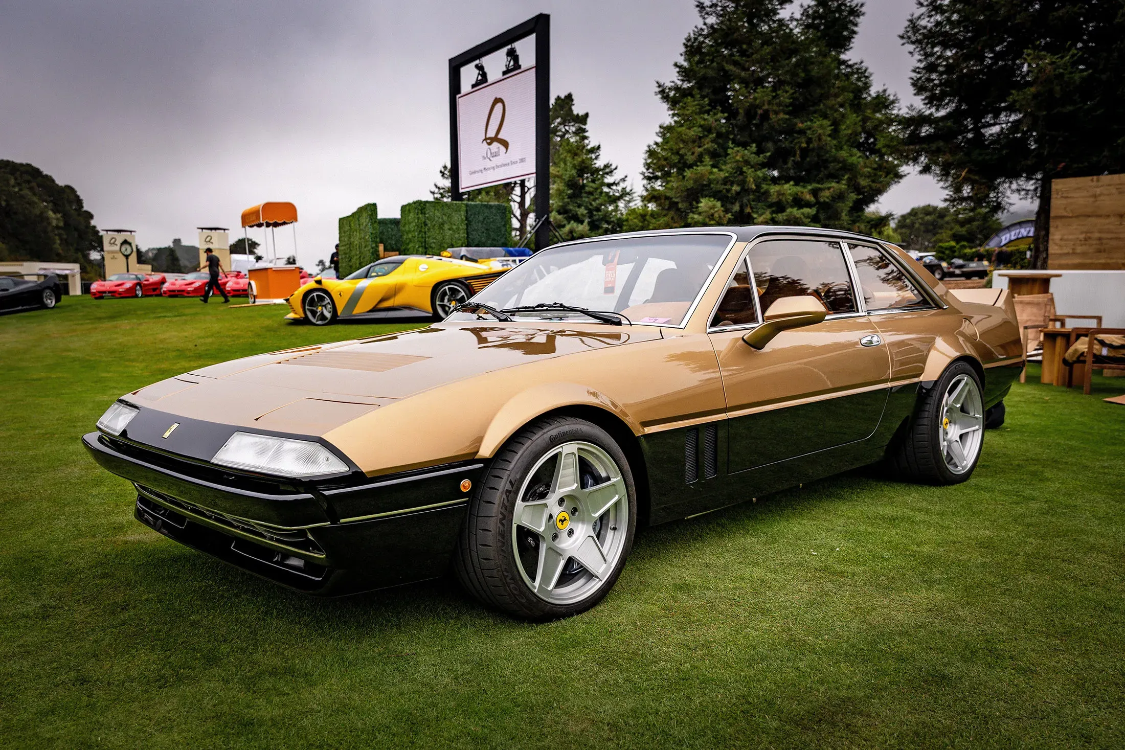 Esteticamente, questa Ferrari 412 è un trionfo di Superfast Gold e nero, con parafanghi allargati, paraurti ripiegati e l’addio definitivo ai fari a scomparsa per un look più filante.