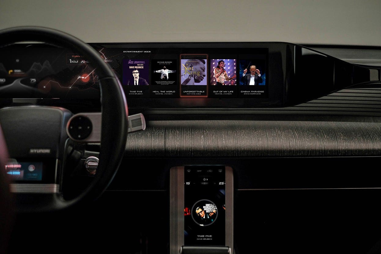 Un secondo schermo nella console centrale viene utilizzato per controllare il sistema audio, insieme a varie funzionalità relative alla guida della Hyundai Grandeur. Questa schermata controlla anche la caratteristica più unica della Heritage Series Grandeur: un pianoforte virtuale, sviluppato dal produttore di strumenti musicali Samick.