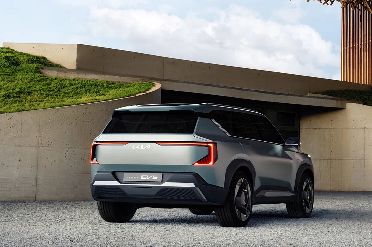 I passaruota sporgenti, e marcati, ospitano cerchi in lega aerodinamici da 21 pollici di diametro, mettendo in risalto soprattutto le pieghe nei pannelli porta in cui non sono presenti maniglie. Nel complesso, il design della KIA Concept EV5 risulta assai minimalista dove KIA ha copiato l’impostazione stilistica del tetto flottante già visto sulla EV9 con parabrezza inclinato e una nuova disposizione nel montante posteriore che funge da unione. Da dietro, i fanali occupano tutta la sezione posteriore in stile boomerang.