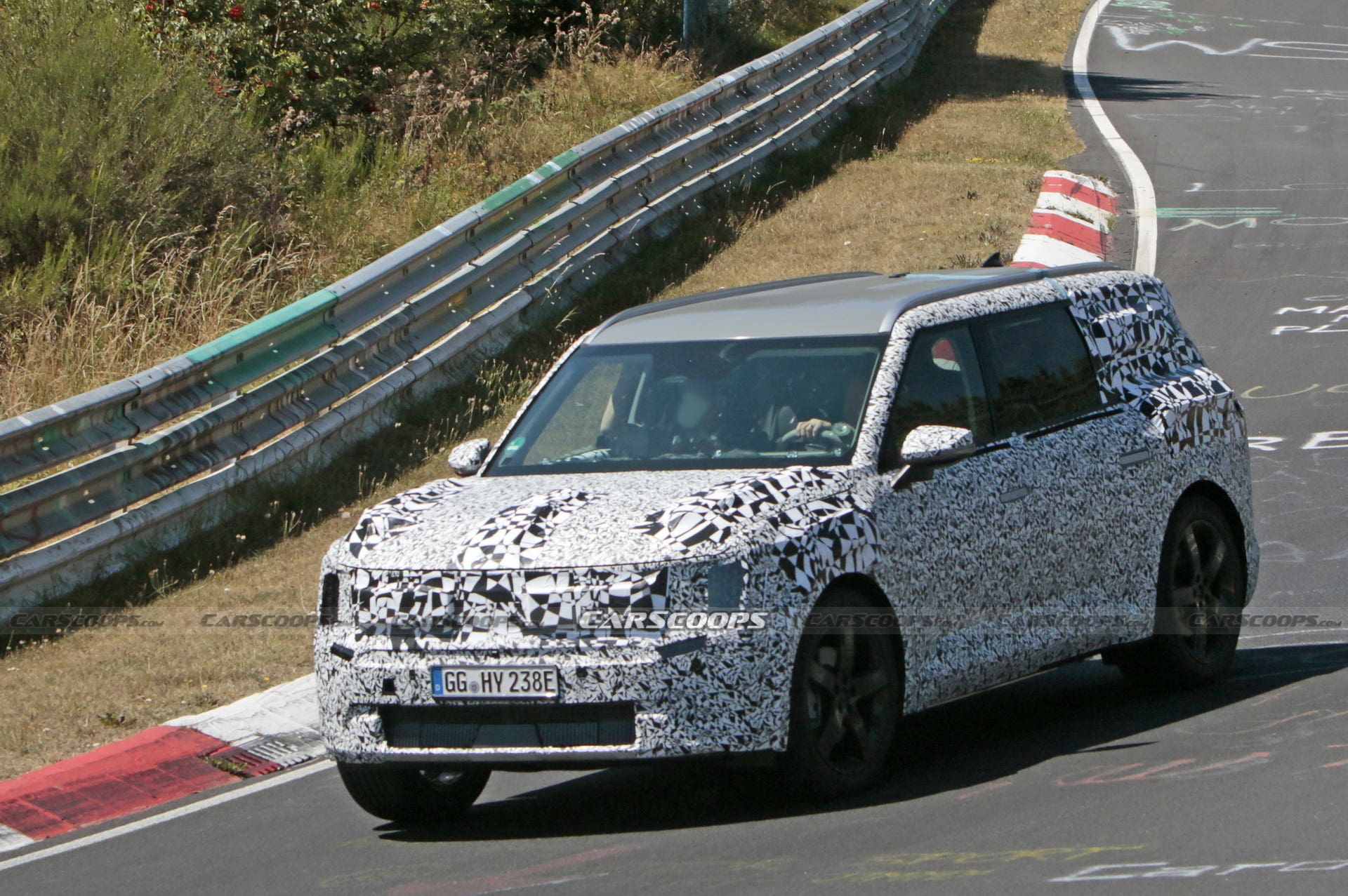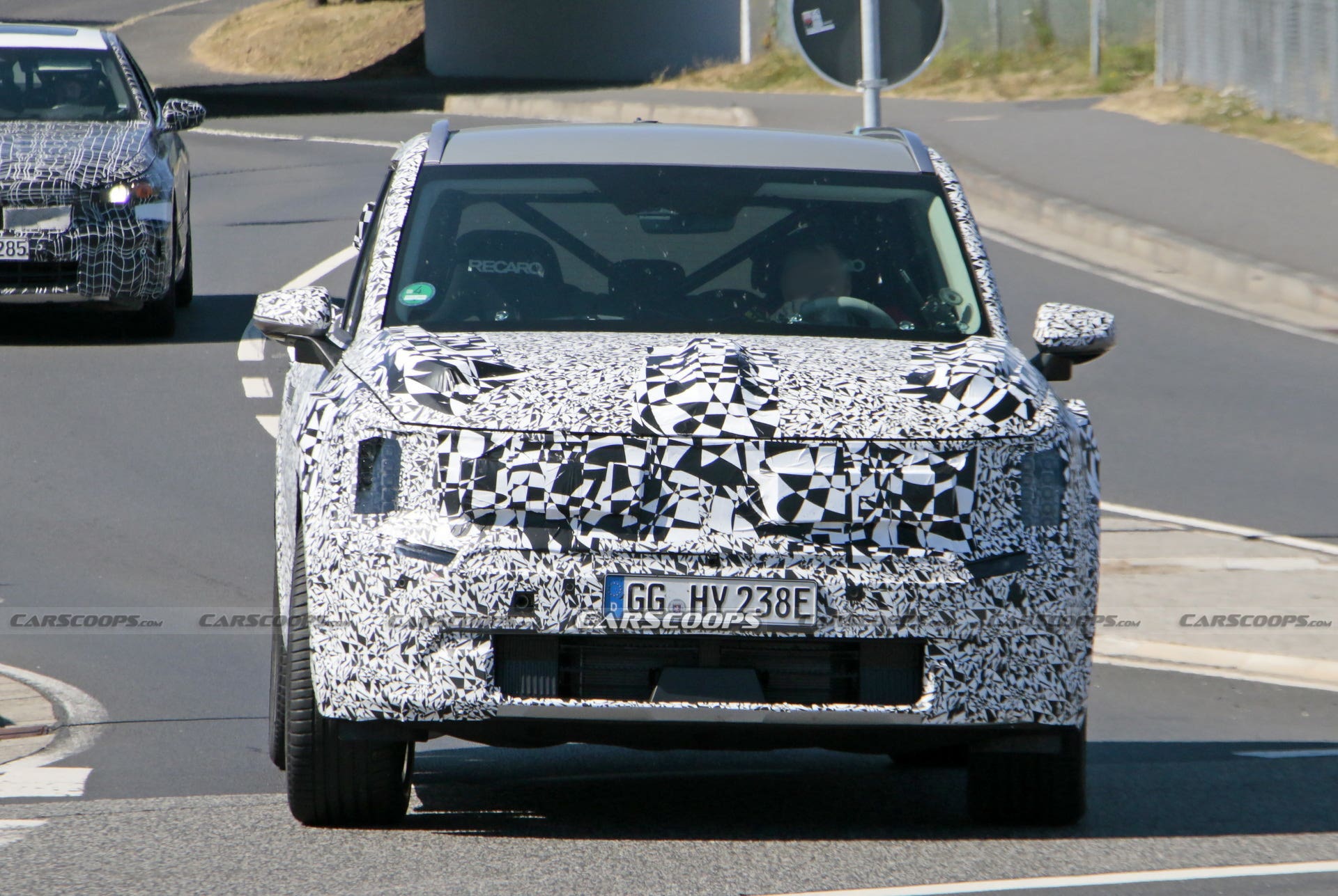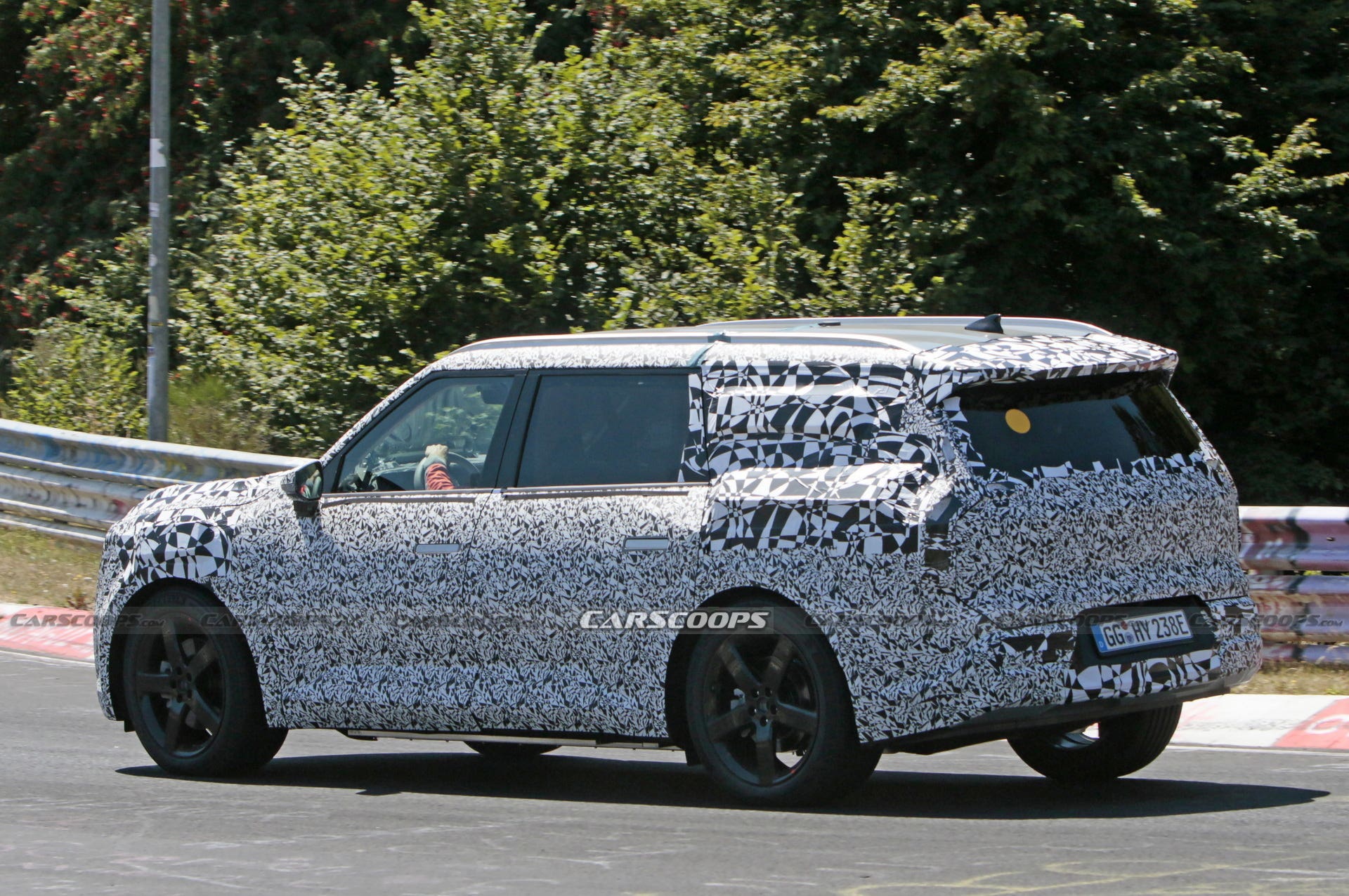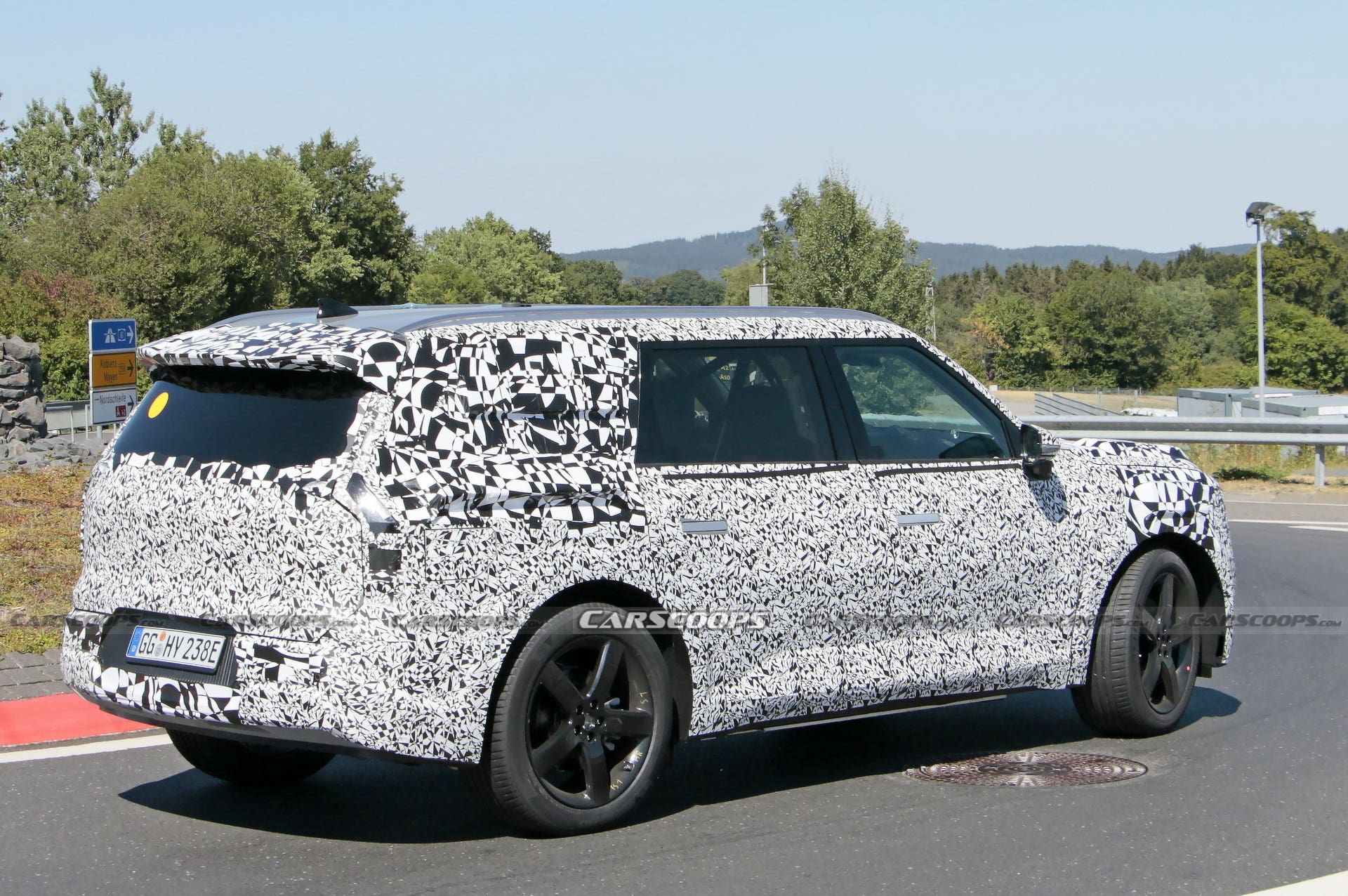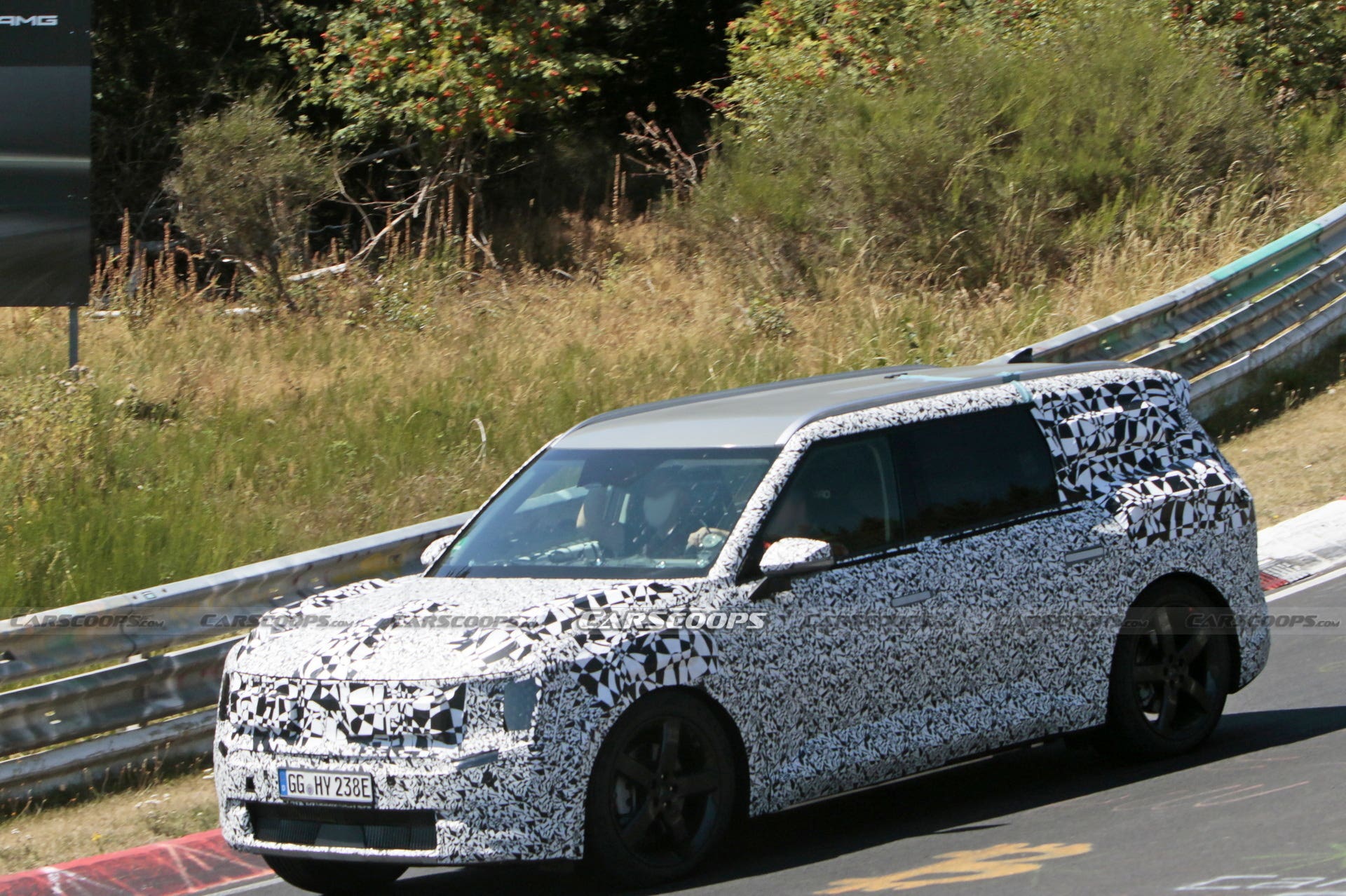 Tuttavia, il design squadrato della KIA EV9 Concept presentato nel novembre 2021 al Salone dell’Auto di Los Angeles rimane su questo veicolo di prova, visto mentre effettuava alcune fasi di test attorno all’iconico tracciato del Nürburgring. Questo sembra essere ancora relativamente all’inizio dello sviluppo, tuttavia, poiché i suoi sedili anteriori sono etichettati Recaro e all’interno è possibile vedere un roll-bar di protezione.