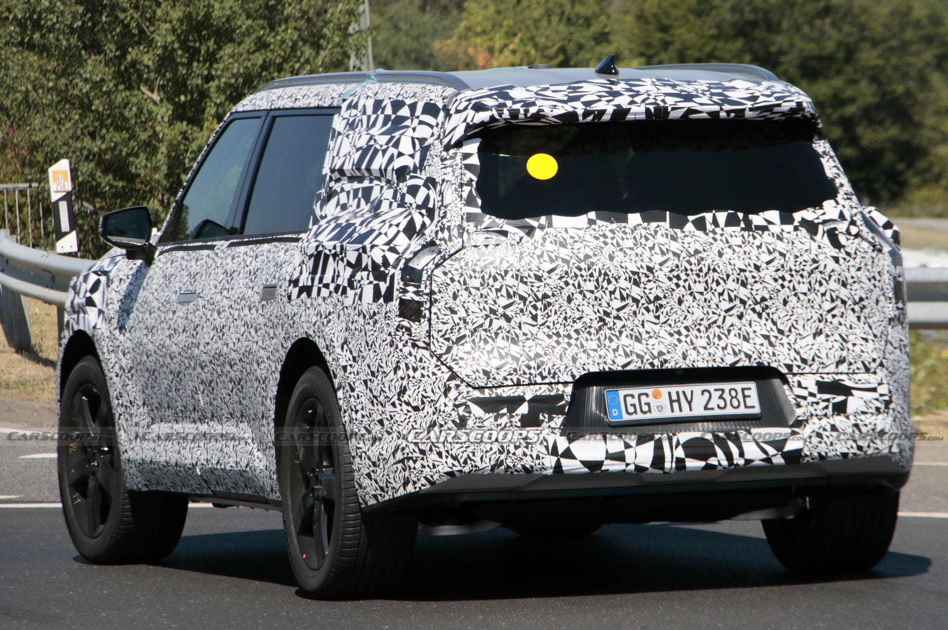 Qui adesso le forme della KIA EV9 sono nascoste soltanto da una nuova mimetica utile a camuffare con maggiore leggerezza le linee della carrozzeria, cosa che ci permette di apprezzare maggiormente le caratteristiche del design ora più visibili che mai anche se ci sono ancora alcune sezioni che sembrano avere degli elementi aggiuntivi utili per impedire di vedere un po’ di più di quanto effettivamente permesso agli occhi indiscreti.