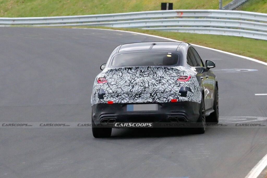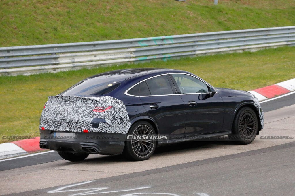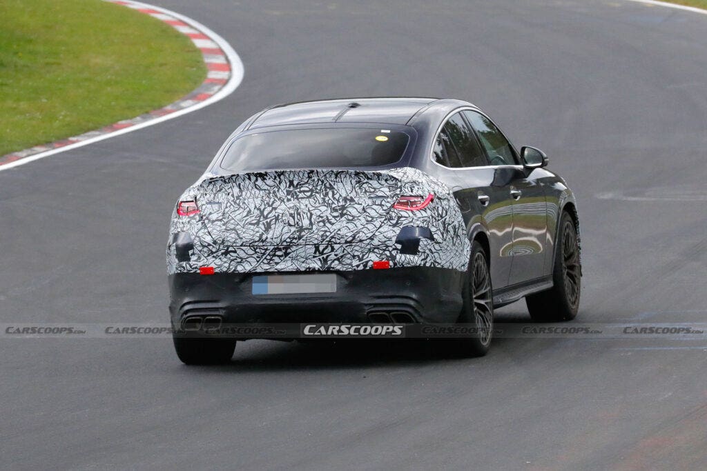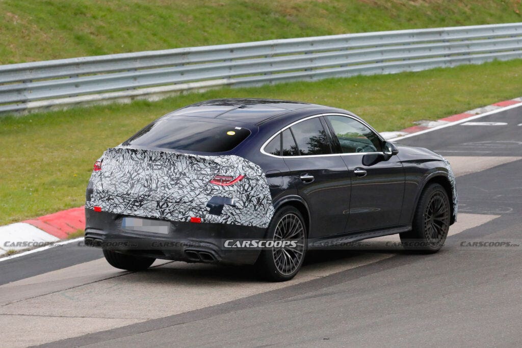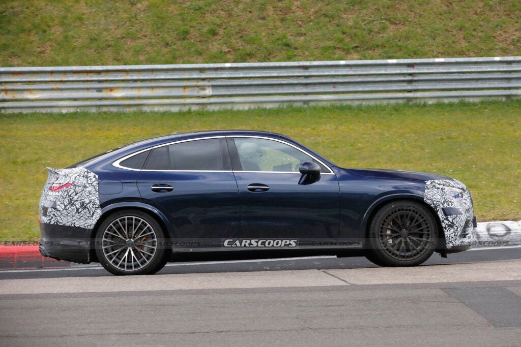 Queste nuove foto spia, decisamente recenti, ci mostrano però un set di dettagli ulteriori su un modello particolarmente atteso. I prototipi precedenti della Mercedes-AMG GLC 63 Coupé presentavano un rivestimento mimetico sulle sezioni anteriore e posteriore, ma anche sulla parte posteriore relativa alle aree di interesse della forma finale delle finestrature laterali. Ora è stato rimosso il camuffamento della parte laterale, lasciando coperti solo il muso e la coda sebbene anche il paraurti anteriore sia meno camuffato che in precedenza e ci indichi come apparirà la Mercedes-AMG GLC 63 Coupé nella sua impostazione finale.