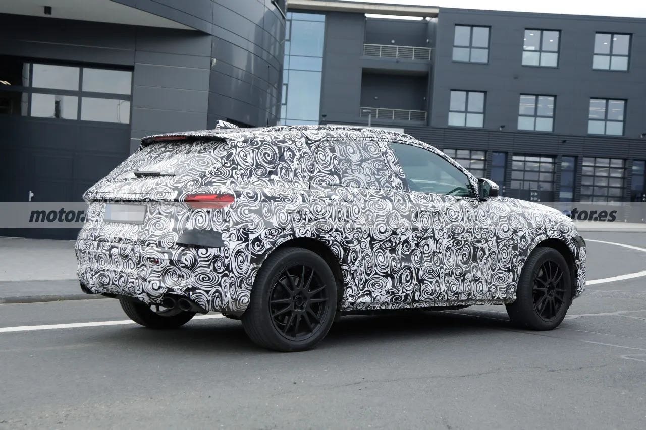 Anche la griglia single frame più ampia è stata ricoperta di camuffamento proprio per questo motivo. La sua caratterizzazione interna è ora diversa, con un nido d’ape più grande. Da dietro l’Audi SQ5 monta pure i fanali di produzione definitivi, rivelando chiaramente che saranno uniti da un estremo all’altro. Definitive anche le finiture dei quattro scarichi, quattro nelle due solite coppie ma un po’ più ellittiche che circolari come in passato.