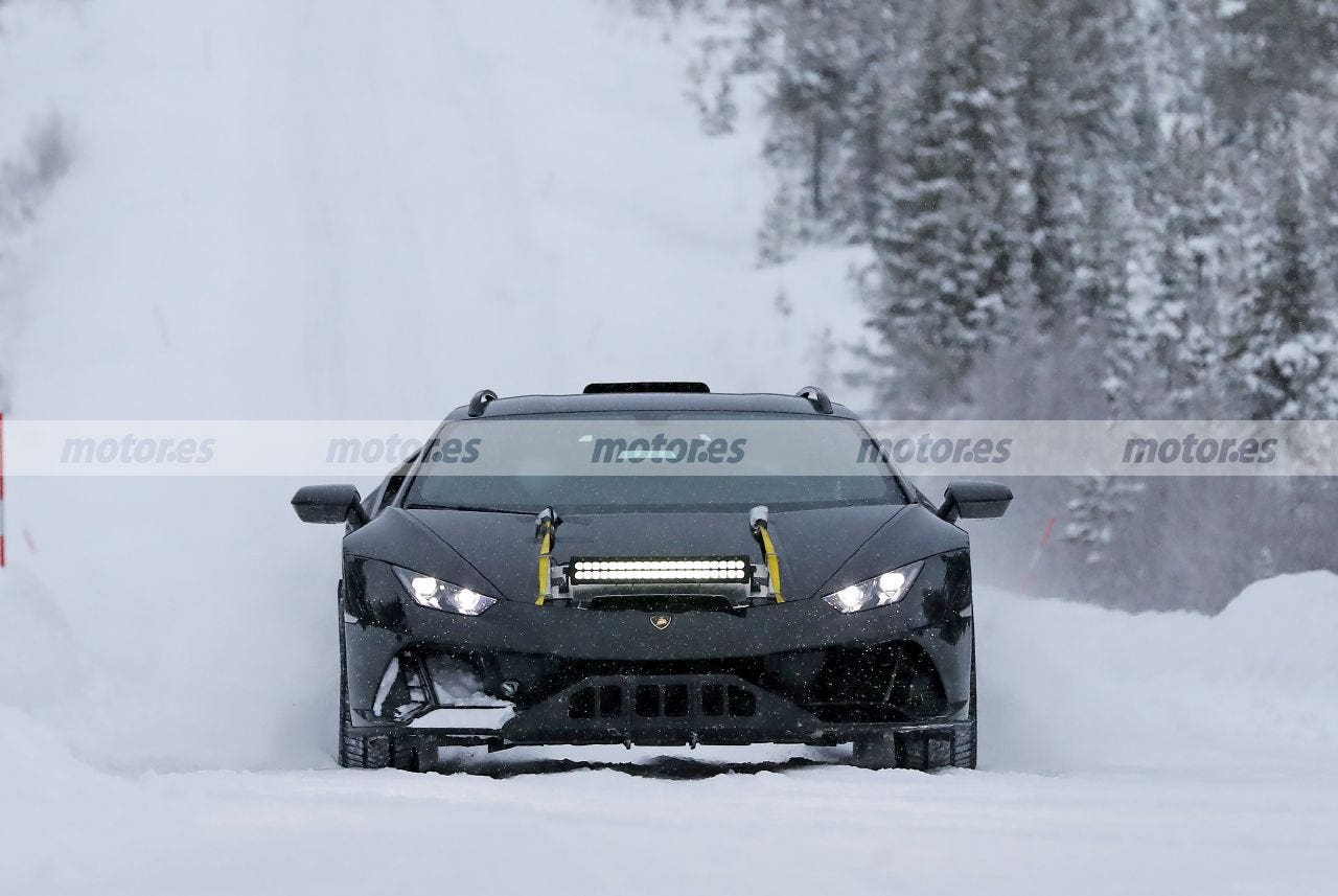 La Lamborghini Huracan Sterrato dispone infatti di una maggiore altezza da terra che rappresenterà uno dei tratti distintivi della sportiva, insieme agli accessori estetici tipici di questa tipologia di vetture. Come possiamo vedere da queste nuove foto spia, la vettura non presenta infatti particolari camuffamenti. La coppia di prototipi braccati mostra un paraurti anteriore inedito, a forma di trapezio, posto al centro del paraurti e persino barre ai lati del tetto. Anche le ruote sono leggermente più grandi del solito, più alte.