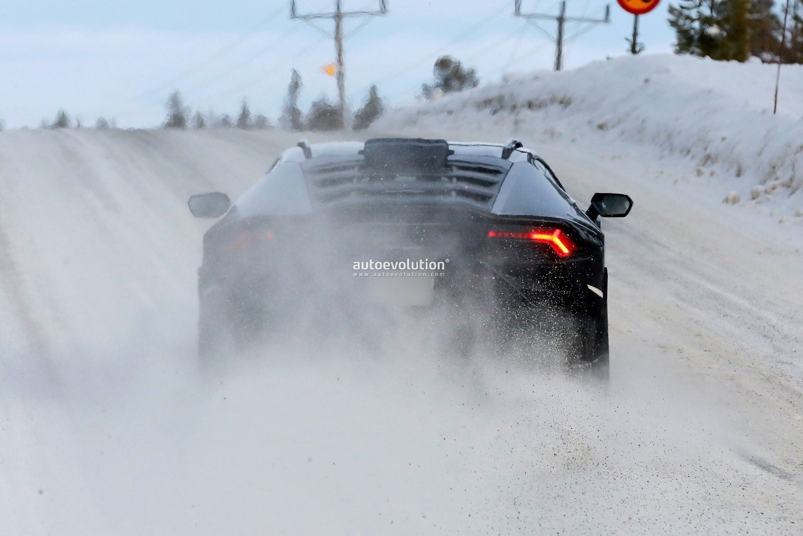 Il diffusore posteriore è invece apparentemente ispirato a quello a disposizione già sul concept, sebbene Lamborghini pare non sia intervenuta pesantemente sulle carreggiate evitando quindi virtuosismi come quelli previsti dalla variante che si era vista qualche anno fa. La concept car aveva anche ampi parafanghi aggiuntivi che non sono visibili qui, anche se ciò non significa che non li vedremo nella versione di produzione.