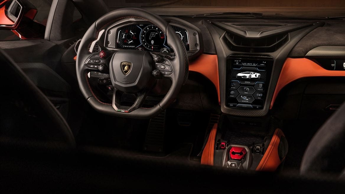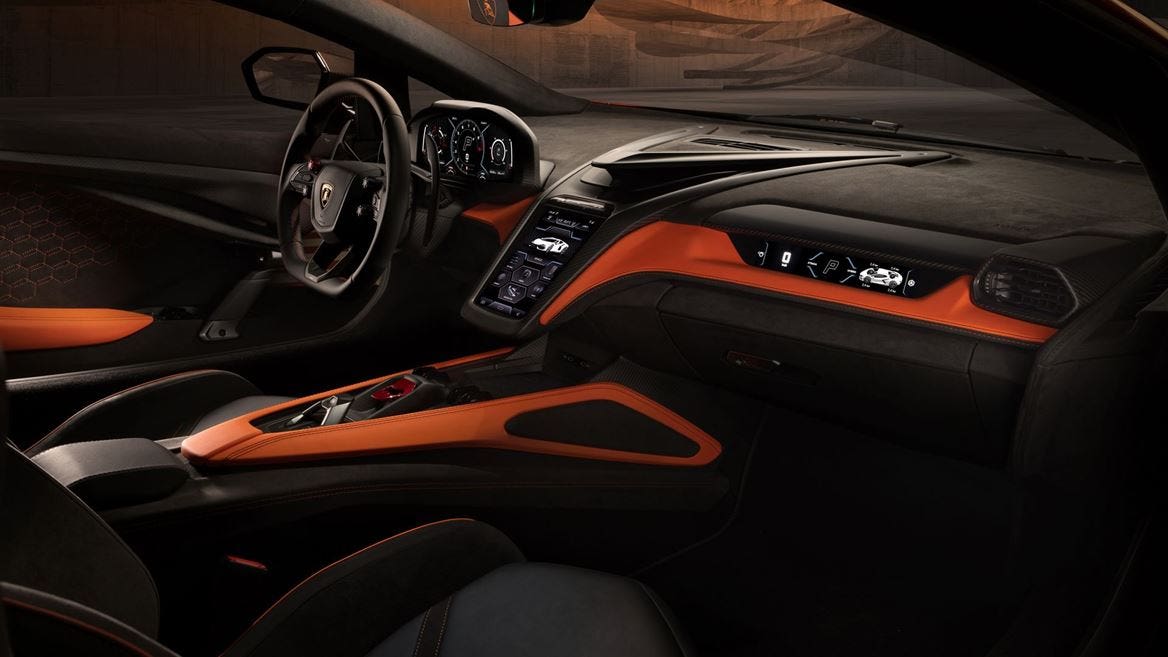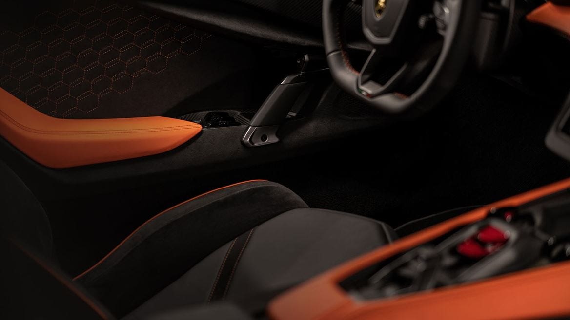 Si ispira alle auto da corsa il design del volante, anche in accordo con l’esperienza già espressa dalla Lamborghini Essenza SCV12. Su questo, i quattro rotori presenti sulle razze permettono di selezionare sia le modalità di guida sia il sistema di sollevamento della vettura e l’inclinazione dell’ala posteriore. Tramite i pulsanti si possono invece attivare gli indicatori di direzione, il lifting system e il launch control, mantenendo sempre una presa ottimale sul volante. Tuttavia Lamborghini ha pensato anche all’usabilità e all’abitabilità destinate all’approccio quotidiano nell’utilizzo del veicolo. Non è un caso che, ad esempio, il nuovo disegno del tetto permette di avere a disposizione un’altezza superiore di 26 millimetri sulla Revuelto rispetto a quella espressa dalla Aventador Ultimae in accordo con 84 millimetri di spazio in più per le gambe.