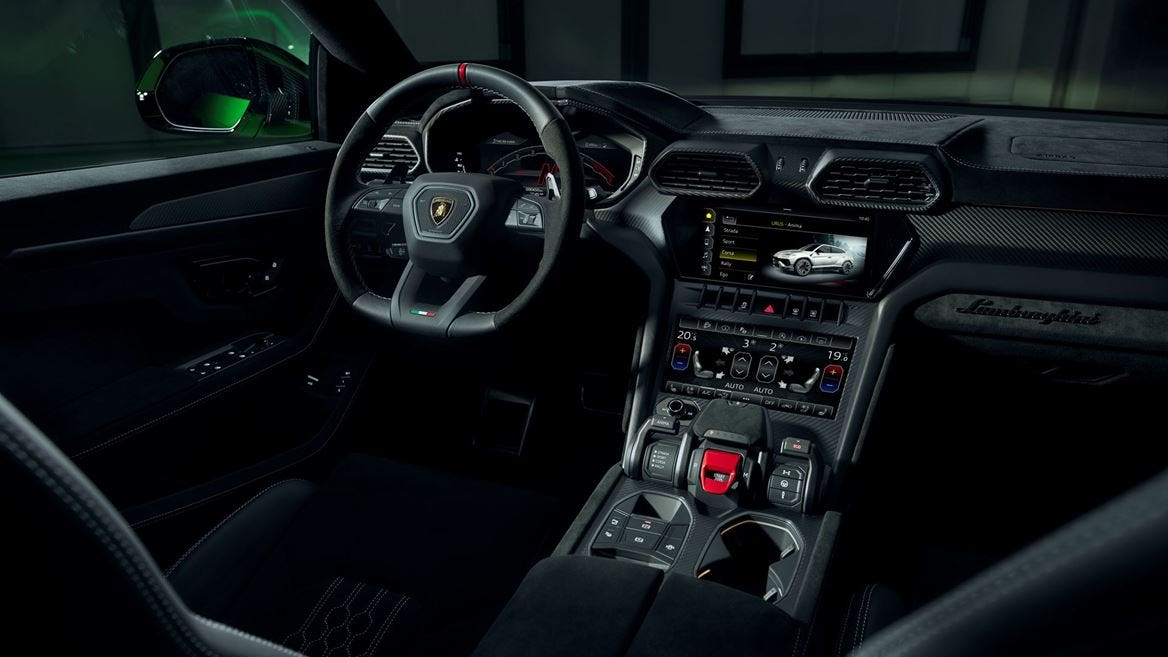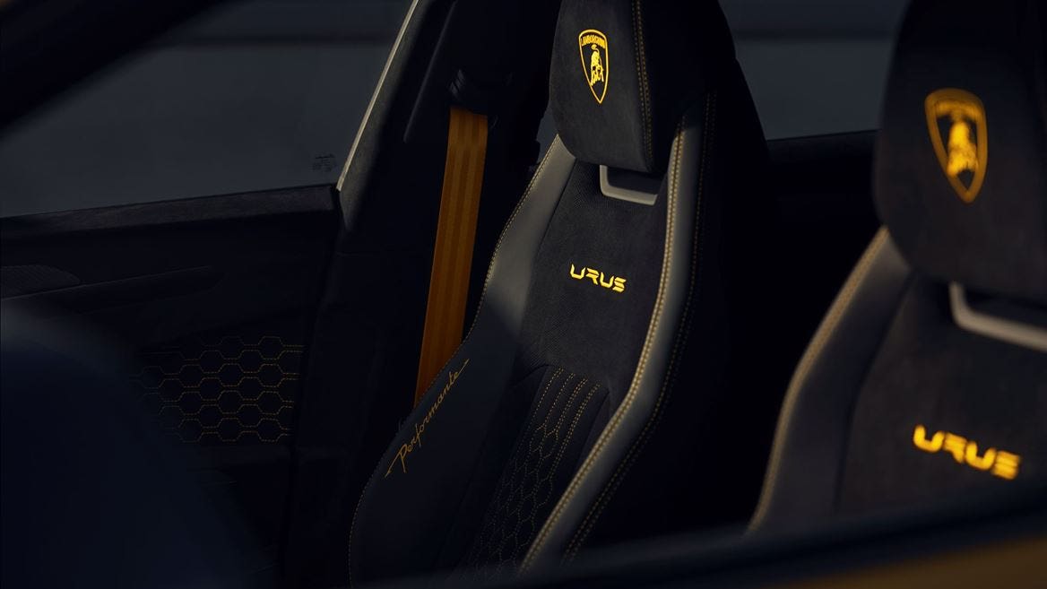 Gli interni di serie sono in Alcantara Nero Cosmus e dotati di cuciture dei sedili che compongono un nuovo motivo esagonale, “Performante Trim”; sono però disponibili ulteriori opzioni che prevedono anche gli interni in pelle. Soluzioni opzionali dedicate per colori e finiture includono l’estensione del motivo Performante Trim alle portiere, al rivestimento del tetto, allo schienale dei sedili e anche al pannello posteriore con ulteriori personalizzazioni che prevedono dettagli in fibra di carbonio opaca, maniglie delle portiere rosse e battuta inferiore delle porte customizzata con logo Ad Personam. Il volante in pelle e Alcantara è rifinito in nero opaco mentre la finitura interna degli elementi in alluminio è disponibile in nero anodizzato. Scegliendo il pacchetto opzionale “Dark Package”, il trattamento nero opaco può essere esteso ad altri dettagli interni come le leve del “Tamburo”, il centro di controllo di Urus, che ospita comandi come il pulsante Start/Stop e il selettore delle modalità di guida. Il display della console centrale e quello del quadro strumenti dispongono ora di una nuova veste grafica per l’interfaccia HMI, con un design dedicato proprio alla nuova Lamborghini Urus Performante.