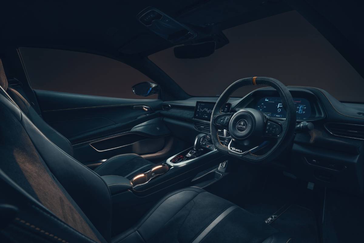 I fari sono a LED e la sua disposizione verticale, così come il suo audace cofano motore, hanno una chiara somiglianza con la soluzione adottata su Evija. I cerchi sono da 20 pollici. Al posteriore, il ruolo di primo piano spetta ai due tubi di scarico, che si trovano all’altezza della targa. Lotus ha voluto dare loro una particolare rilevanza per sottolineare il fatto che è l’ultima vettura a combustione ad uscire da Hethel.