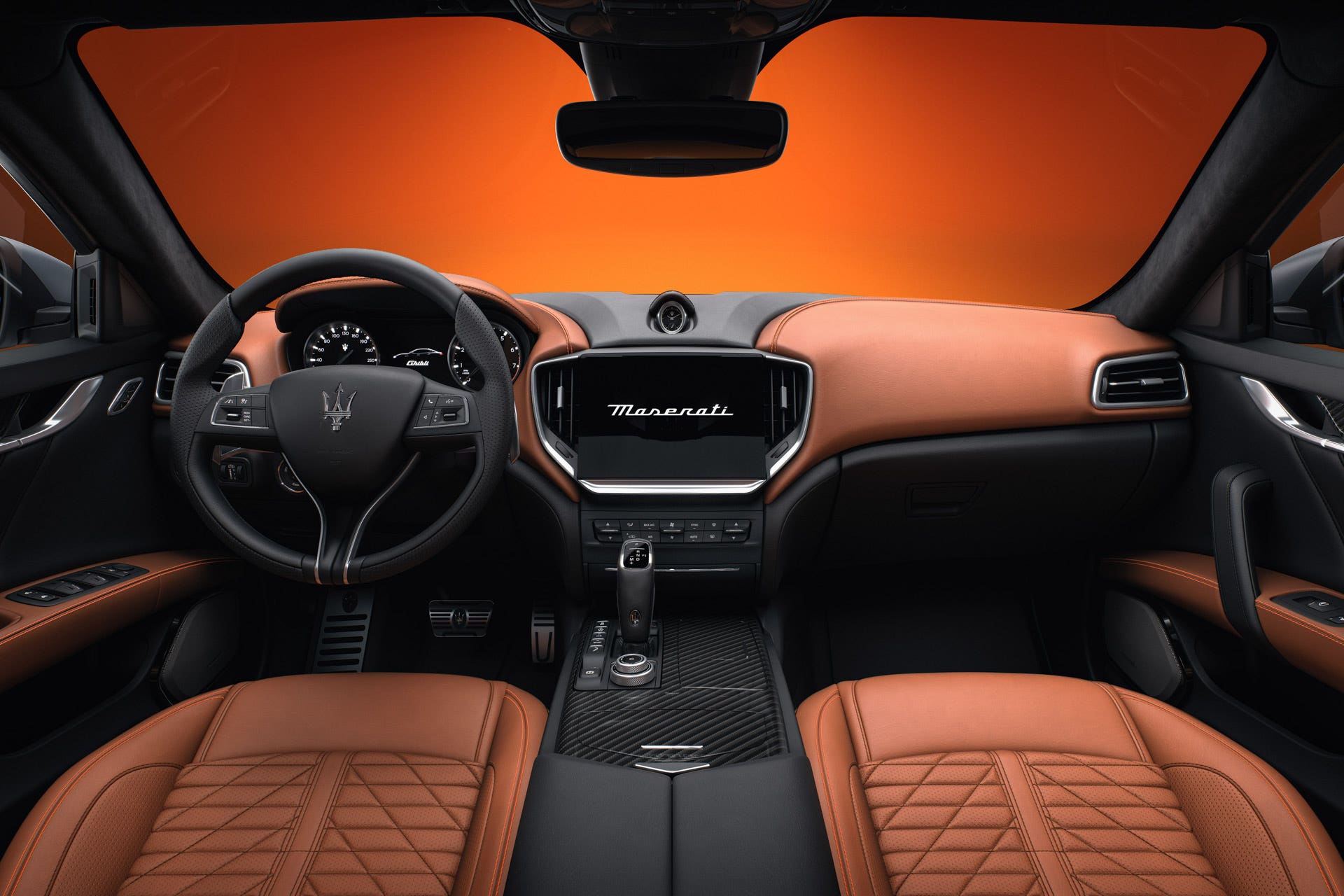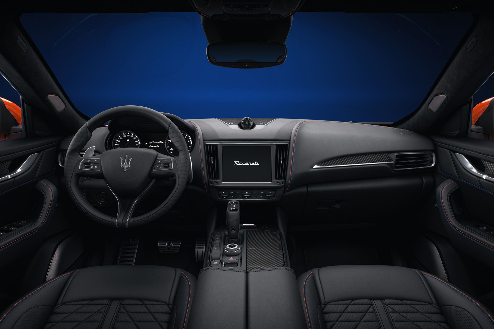 Per la carrozzeria Grigio Lamiera, il colore dei cerchi vira verso il Glossy Black, mentre i dettagli, lo stemma specifico e il logo del Tridente sono di colore arancione a contrasto. Entrando nell’abitacolo, le tonalità delle finiture esterne sono riprese dalle cuciture blu cobalto e arancio, abbinate alla pelle Pieno Fiore nera o arancione oppure ancora naturale.
