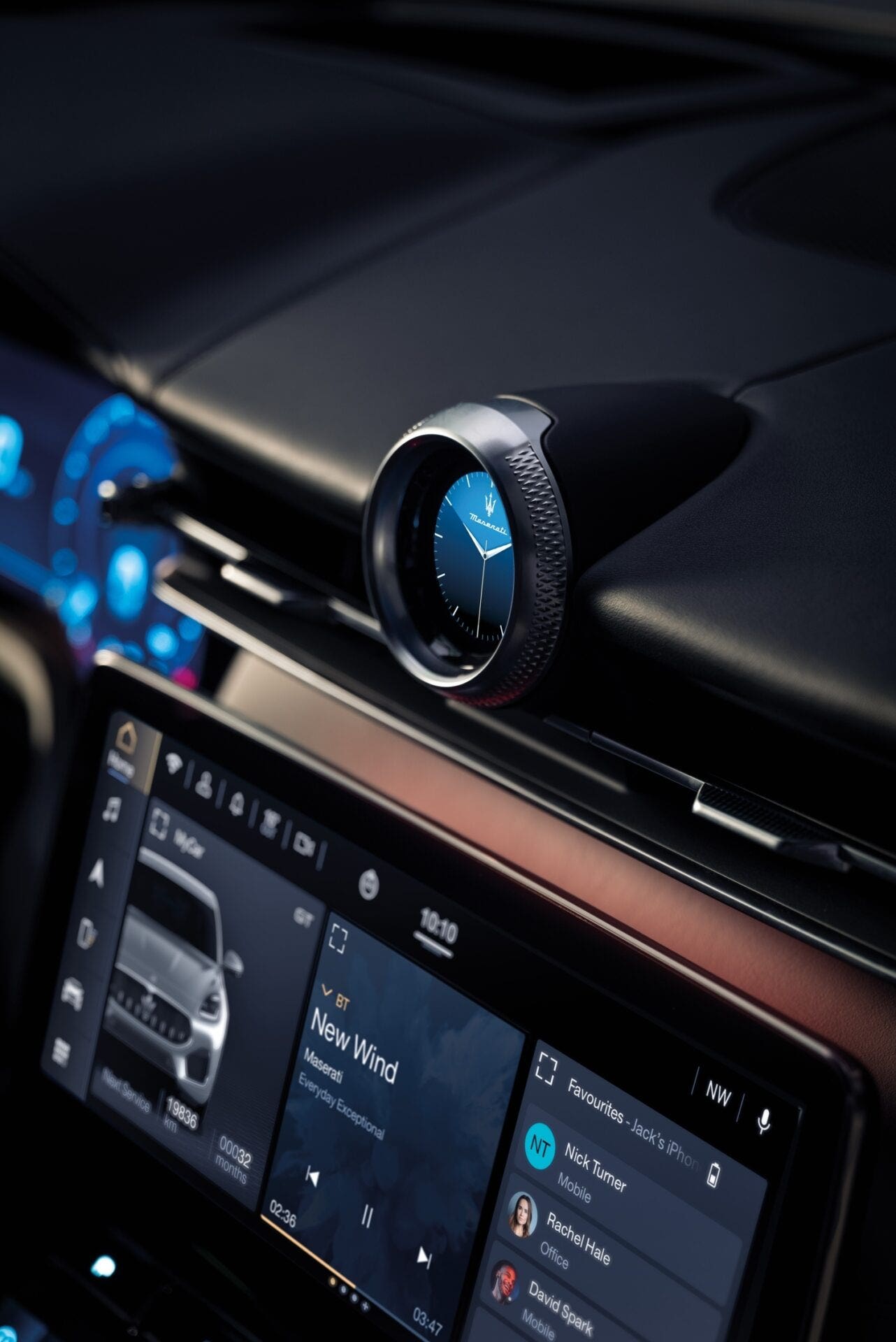Il senso di modernità è enfatizzato dalle specifiche tecniche avanzate e dalla purezza del design: la vettura è dotata di ben quattro schermi: il classico cluster, il nuovo pannello centrale da 12,3 pollici, un pannello comfort più piccolo da 8,8 pollici con comandi extra e il nuovo orologio digitale il primo nella storia del marchio Tridente, che diventa una vera e propria interfaccia guidatore-auto. Non dice più solo l’ora: può anche emettere un segnale di risposta ogni volta che riceve un comando vocale. Assume una forma classica, ma si presenta con una visione futuristica, quasi un tema dominante per la Grecale, che ci dice se il contatto con l’auto è attivo e se l’auto “ci ascolta mentre le parliamo”. Non solo uno schermo digitale per cambiare pelle e aspetto secondo i nostri gusti. Piuttosto, è qualcosa di più e può anche diventare una bussola o un misuratore di forza G, se necessario.