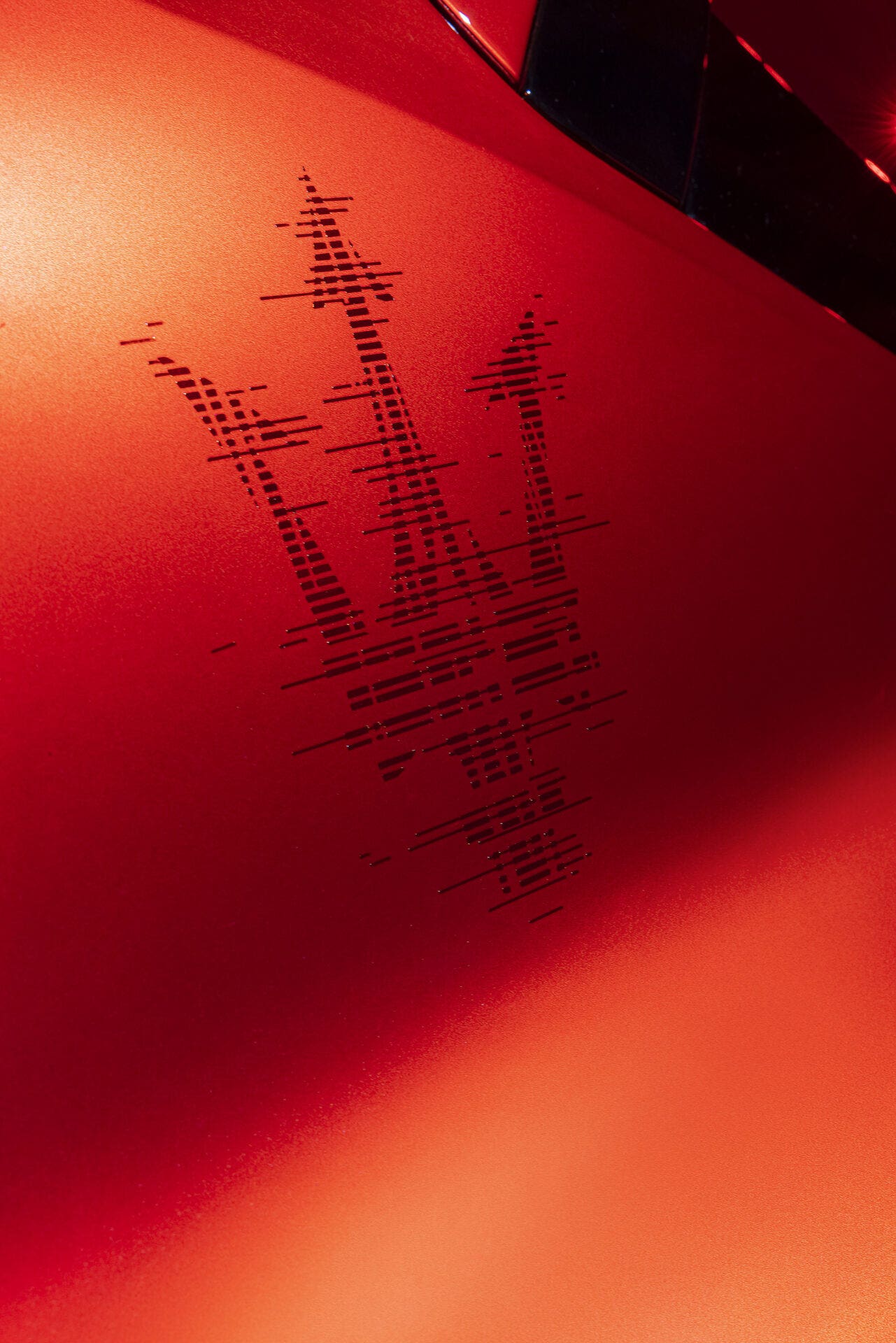 Tutti i badge sono specifici per il modello e il tridente sul montante C si fonde con la carrozzeria, conferendole un aspetto 2D di proporzioni maggiori del solito. Il design del logo del Tridente è stato rivisitato con un effetto glitch, sia simboleggiando il ritmo delle onde e le informazioni che arrivano dallo spazio, sia riportando alla mente la sensazione di movimento ad altissima velocità. L’effetto specchio è simile a una lente solare, qui incastonata nell’arancione scuro della carrozzeria.