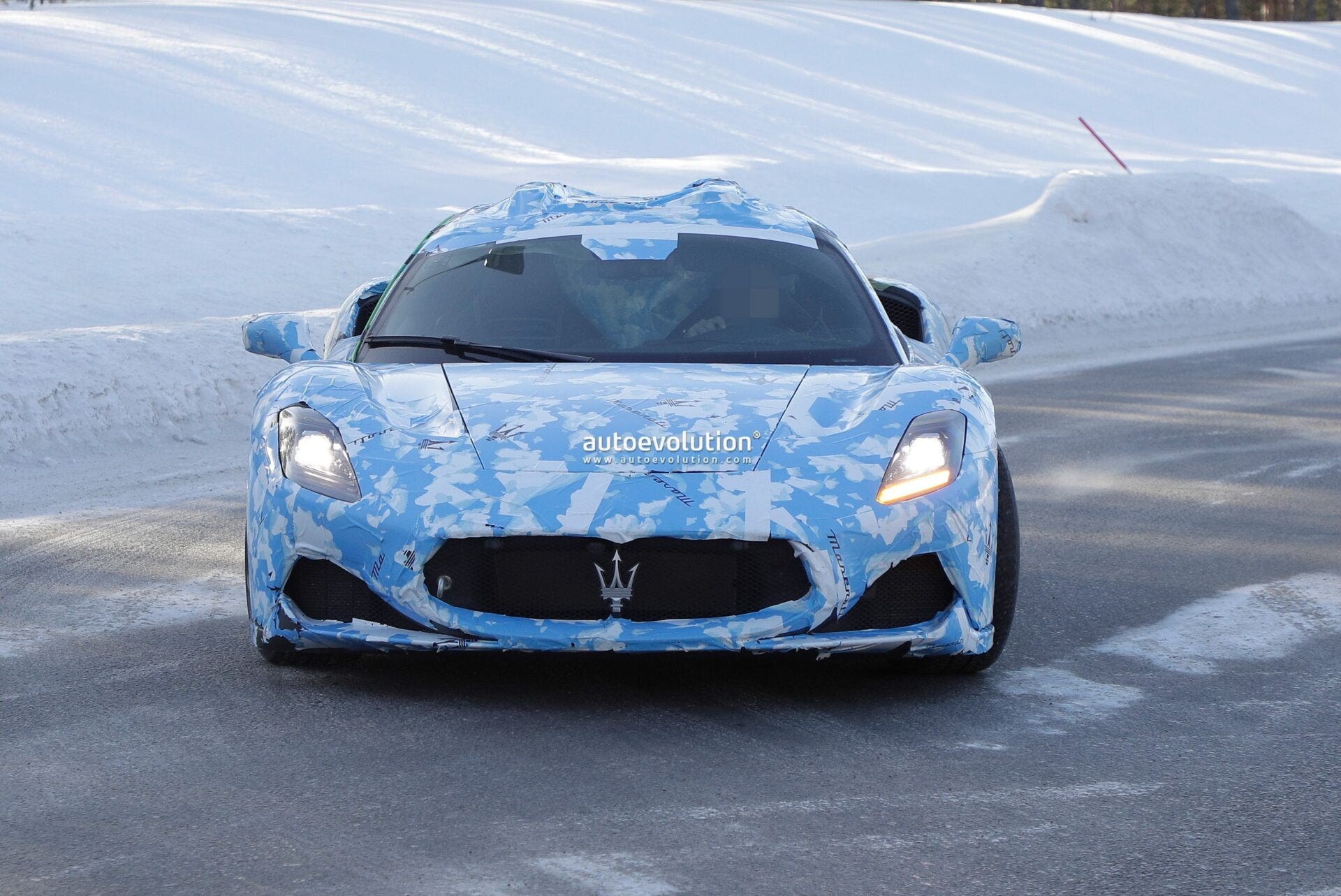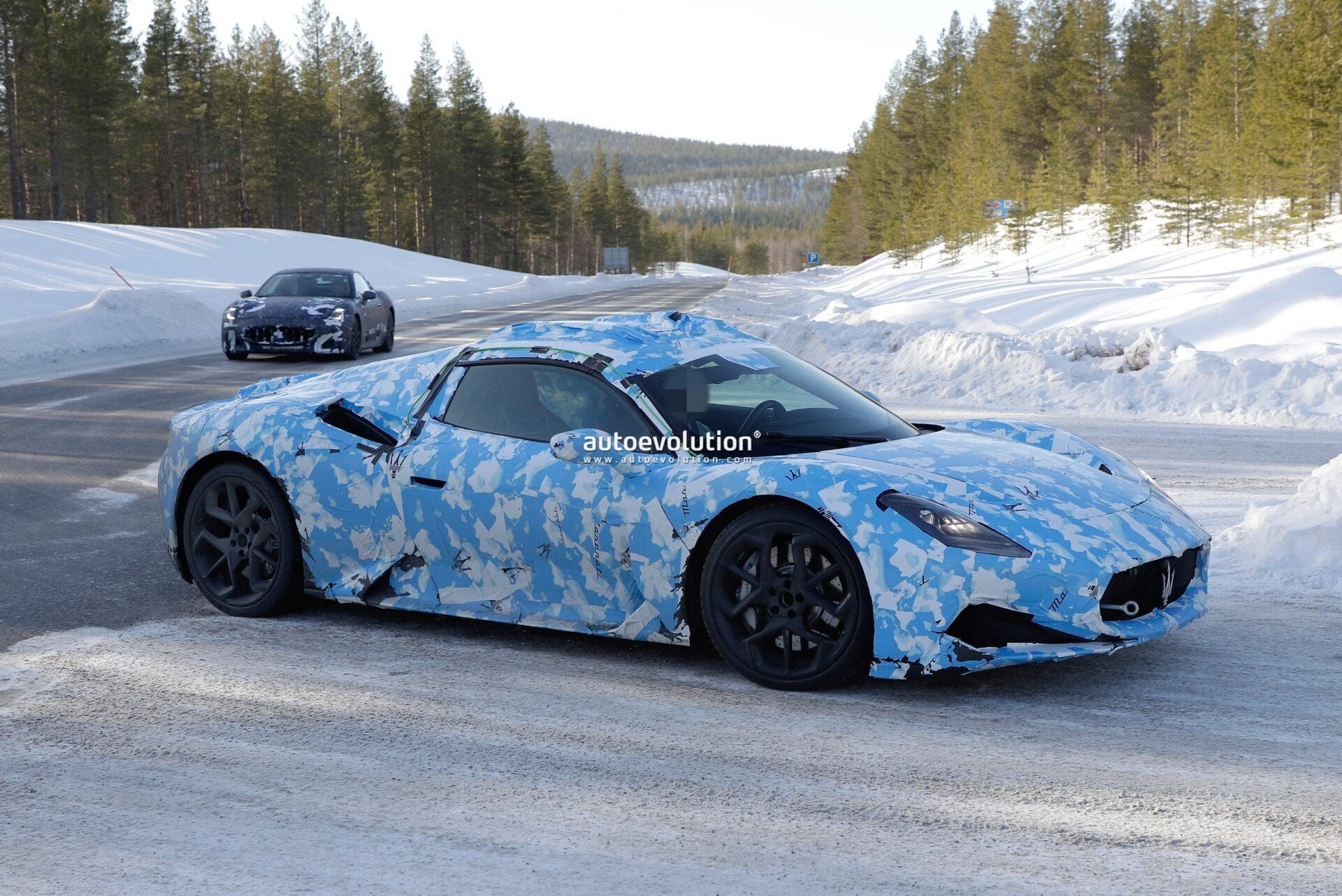 Parliamo di un’autentica Spider che ha appena preso parte a questa sessione di test invernali a cui si riferiscono le immagini, approfittando del fatto che l’ultima stagione dell’anno si allunga con le basse temperature in Svezia. La nuova Maserati MC20 Cabrio è stata avvistata appunto camuffata con la stessa livrea già utilizzata per l’annuncio ufficiale: un aderente vinile bluastro con lo stemma del Tridente sulla griglia, ben visibile, e con generose prese d’aria che accompagnano la griglia principale.