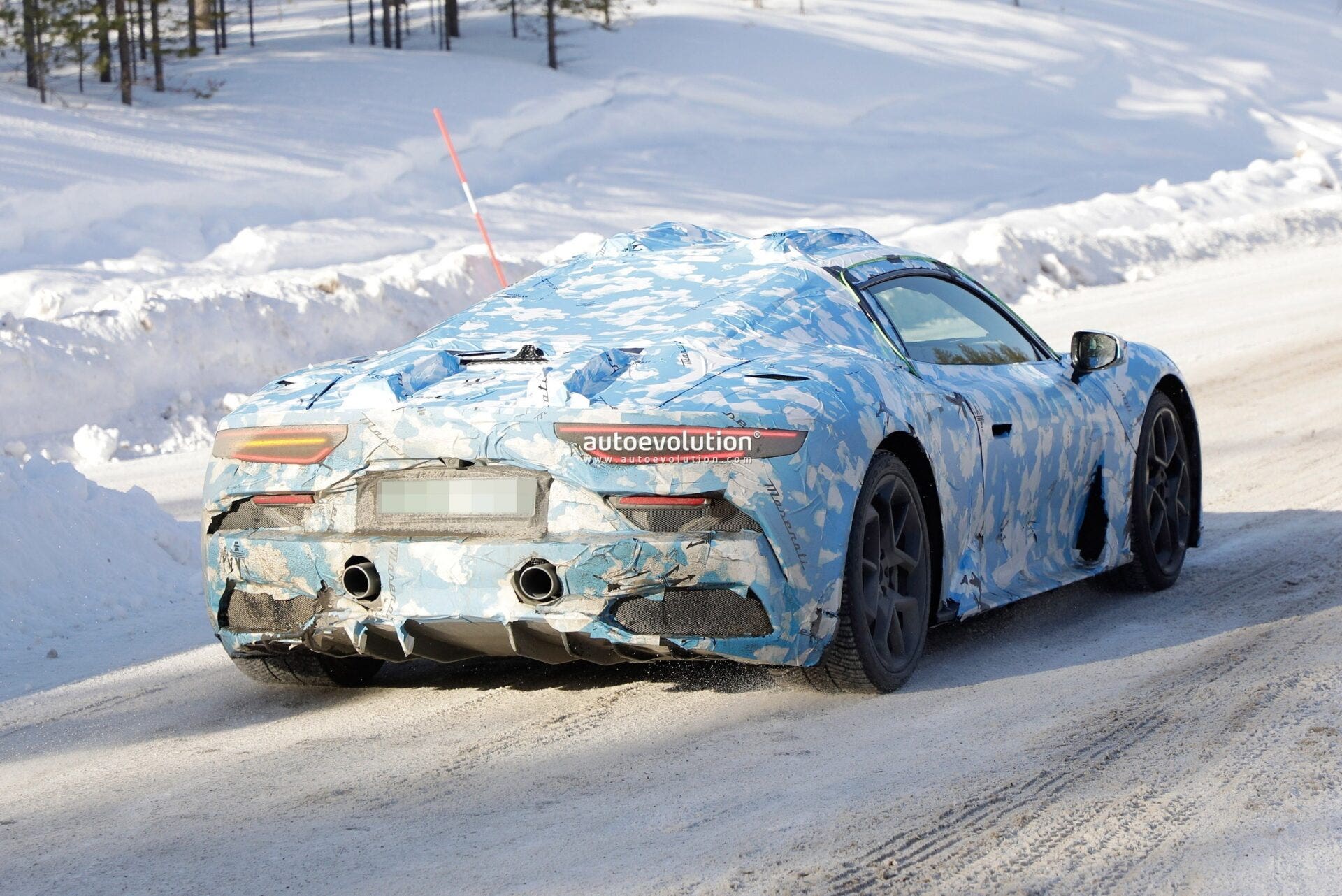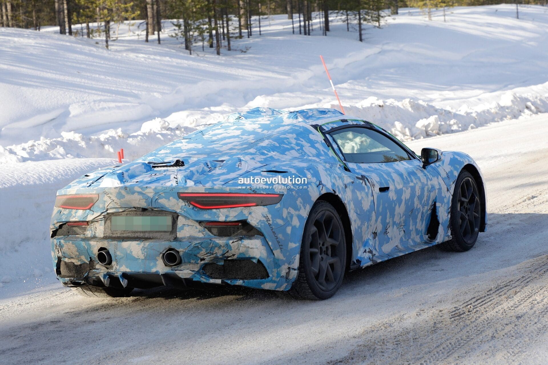 Non ci saranno novità estetiche rilevanti nemmeno al posteriore, dove si apprezza il design moderno dei fanali con disposizione orizzontale, la coppia di scarichi rialzati centrati sotto la targa e le grandi prese d’aria per l’estrazione del calore sulle fiancate che, pur essendo rivestite da una rete metallica, non presentano modifiche. Ma Maserati ha fatto in modo che non un singolo dettaglio del motore e dell’area del tetto fosse visibile sul retro.