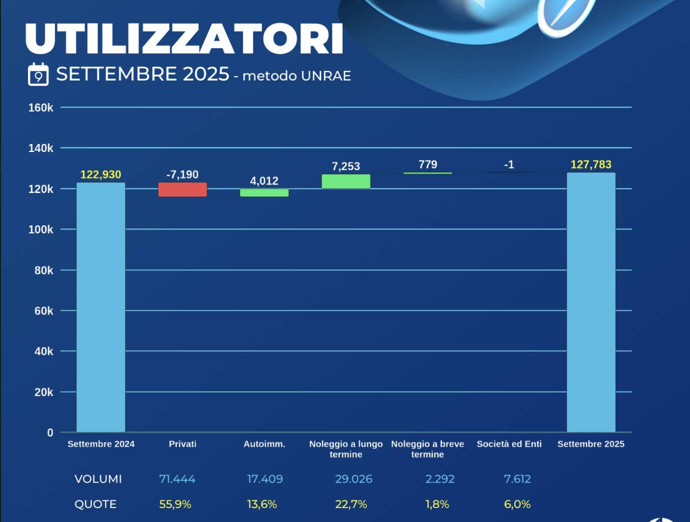 Addirittura, per Federauto, a settembre il contributo delle reti concessionarie in termini di auto immatricolazioni è stato oltre misura: il 13% del totale. Questo spiega il risultato positivo del mese che, oltretutto, ha beneficiato di una performance numerica importante del noleggio lungo termine.