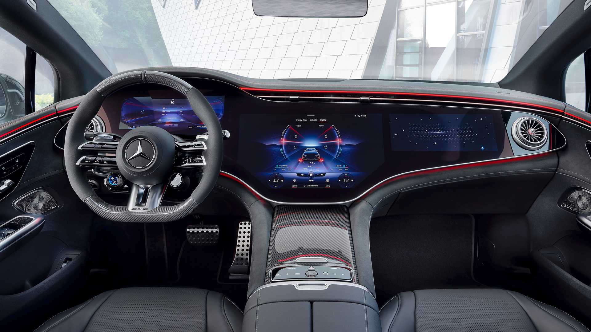 La dotazione include cerchi in lega da 20 o 21 pollici, impianto frenante carboceramico e il pacchetto AMG Night che consente di rendere più dark la vettura. All’interno dell’abitacolo troviamo il sistema di infotainment MBUX con il display che copre tutta la plancia come sulla EQE.