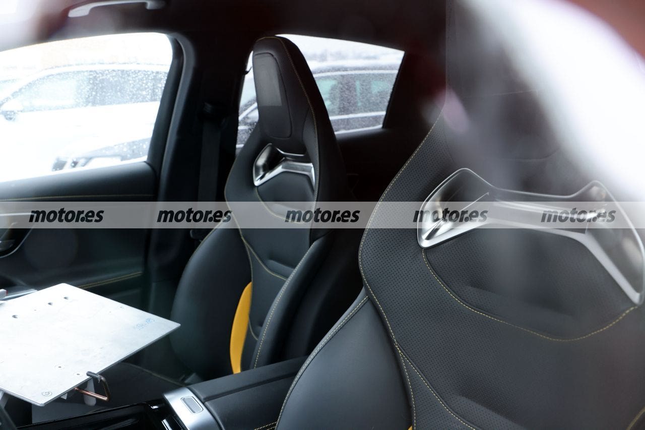 Perché, per la prima volta, possiamo vedere completamente esposti gli interni di serie di questo SUV sportivo ora che queste foto spia ci mostrano nei minimi dettagli i sedili avvolgenti sportivi rivestiti in Pelle Nappa, con i loro poggiatesta integrati e le cuciture gialle. Lo stesso colore delle cinture di sicurezza, oltre alle modanature in fibra di carbonio che decorano la plancia o il nuovo volante multifunzione con comandi touch di questo GLC Coupé più esasperato.