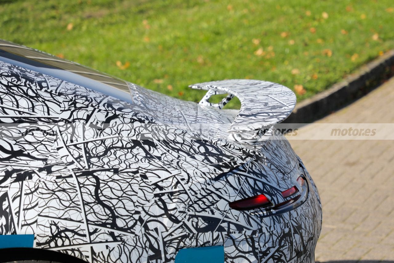 Sebbene sia effettivamente ben camuffato, si può comunque vedere un bordo più prominente sul paraurti anteriore; si tratta di una chiara indicazione del fatto che la sportiva disporrà di un nuovo spoiler in questa zona che aumenterà il carico aerodinamico sull’asse anteriore, distinguendosi per essere realizzato in fibra di carbonio. Il medesimo materiale valorizzerà anche le prese d’aria di generose dimensioni previste per il paraurti anteriore.