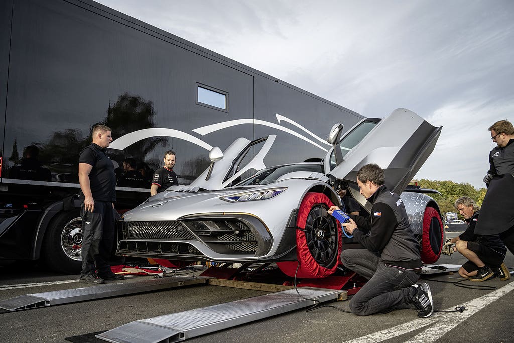 Tecnicamente, la Mercedes-AMG ONE offre già tutto di serie per mettere a punto l’impresa: la hypercar porta per la prima volta la tecnologia di guida ibrida di Formula 1 dalla pista alla strada. Con un motore a combustione e quattro motori elettrici, l’ibrido E PERFORMANCE eroga un totale di 782 kW (1.063 cavalli), con una velocità massima di 352 km/h. Altra tecnologia proveniente dagli sport motoristici spazia dalla monoscocca in carbonio, dalla carrozzeria in carbonio fino all’unità motore/trasmissione come elemento sollecitato quindi dall’aerodinamica attiva al telaio push-rod. Con la sua tecnologia complessa, la Mercedes-AMG ONE a due posti offre in alcuni casi anche più di un’auto da corsa di Formula 1. È dotato della trazione integrale AMG Performance 4MATIC+ completamente variabile con assale posteriore a trazione ibrida e assale anteriore a trazione elettrica con torque vectoring.