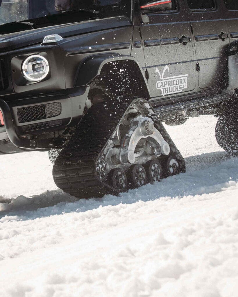 La conversione è stata intrapresa dal tuner Delta4x4 e dallo specialista di fuoristrada CapricornTrucks. Per adattarsi alle nuove “scarpe” fornite dalla statunitense Mattracks, la G500 ha ottenuto un aumento dell’altezza da terra di ulteriori 200 mm. I cingoli da neve 88M1-A1 sono realizzati in gomma rinforzata con fibre, ottime per l’utilizzo a temperature fino a -40 gradi. Ogni modulo pesa circa 170 chilogrammi che si traducono in 680 kg per il set di quattro elementi. Oltre ad aggiungere peso, tuttavia, i cingoli aggiungono un’enorme quantità di aderenza grazie alla loro ampia area di contatto (tra 424 e 600 centimetri quadrati). Ciò consente alla robusta Mercedes Classe G, oggetto della trasformazione, di attaccare pendii innevati e ghiacciati, purché la velocità massima rimanga al di sotto dei 65 km/h.