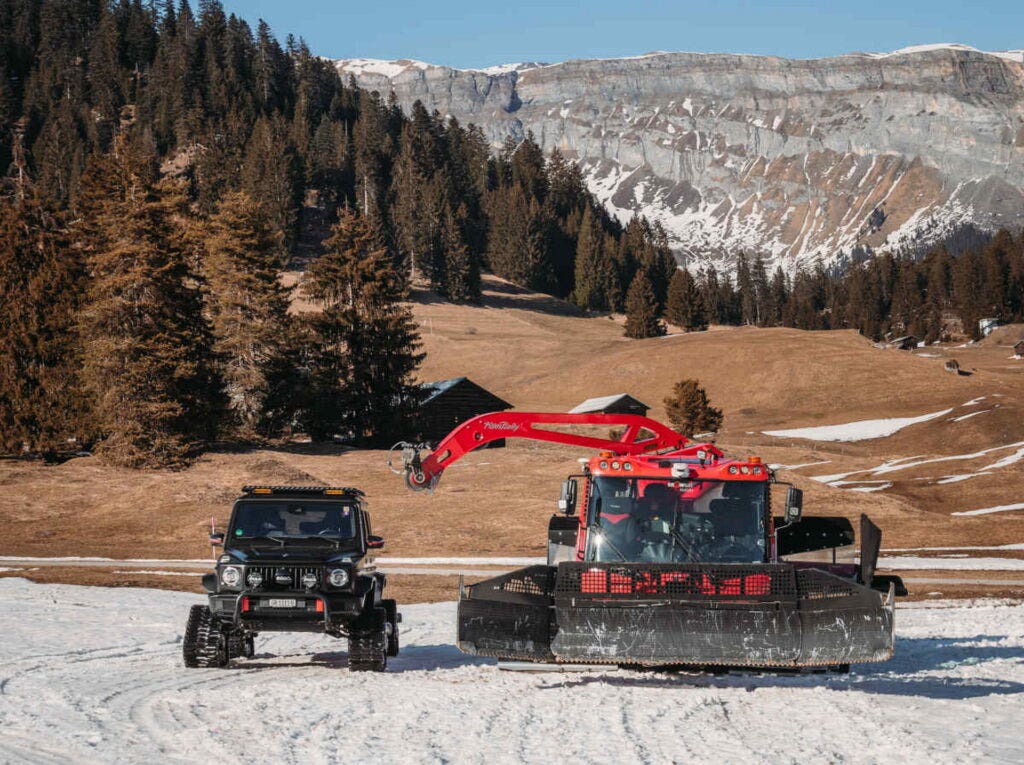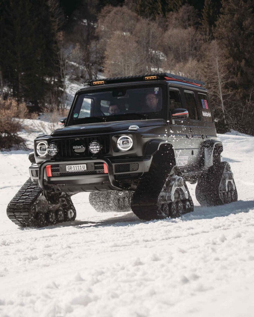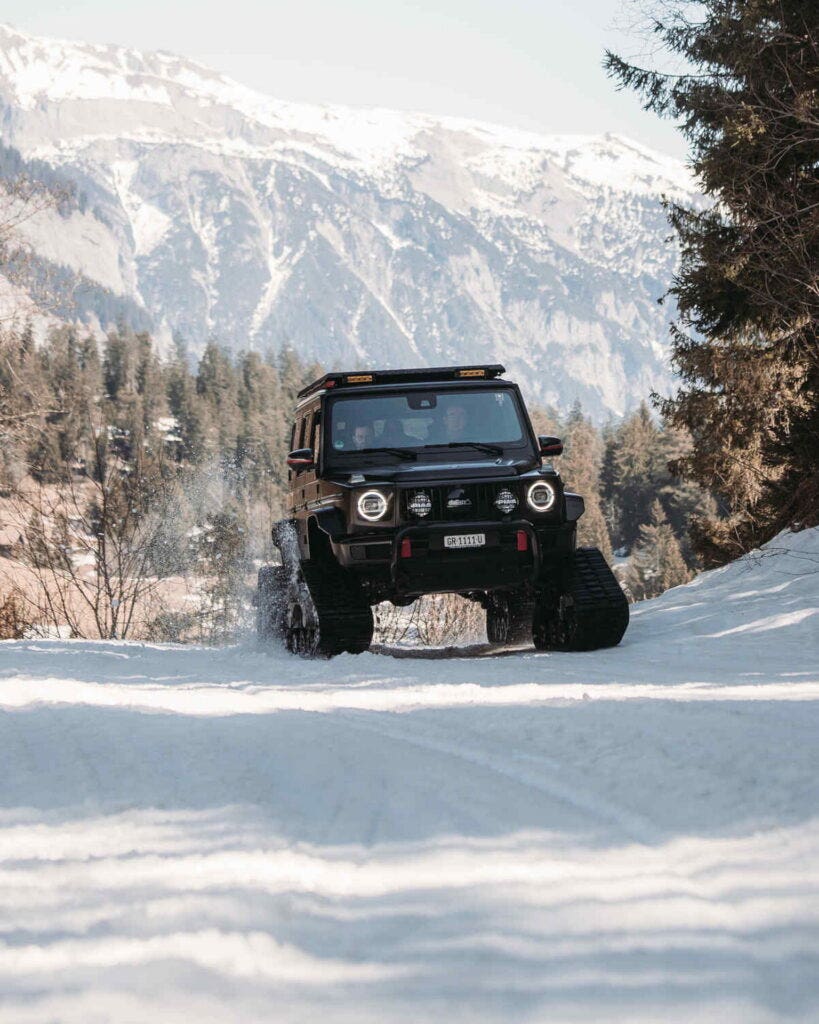 L’iconica Mercedes Classe G è uno dei SUV più adatti al fuoristrada nel segmento di lusso. Tuttavia, un proprietario svizzero non era soddisfatto delle prestazioni della sua G500 di serie in condizioni di fondo interessato dalla neve, quindi ha deciso di sostituire le ruote con dei veri e propri cingoli dedicati alla guida su tracciati nevosi.