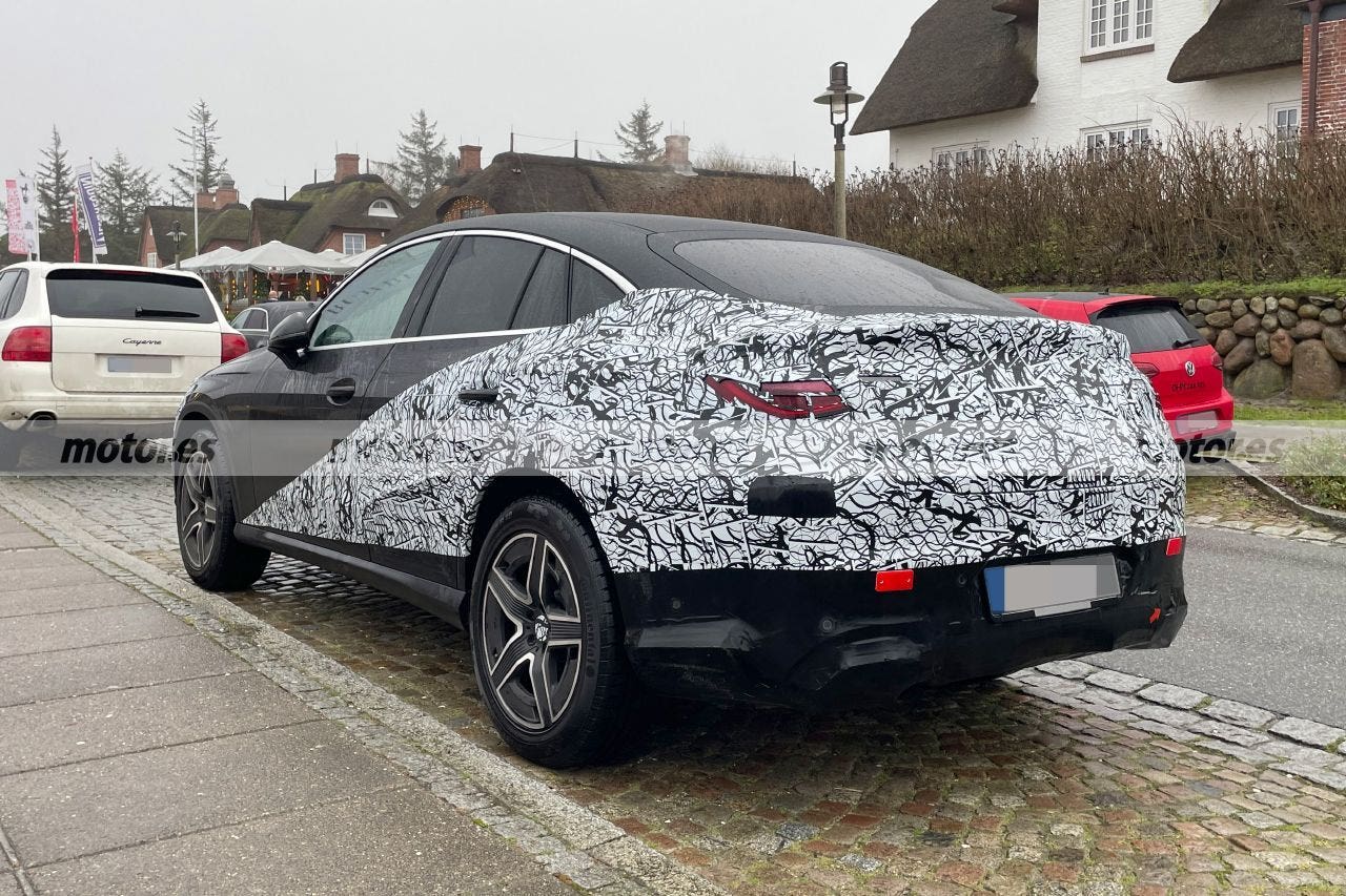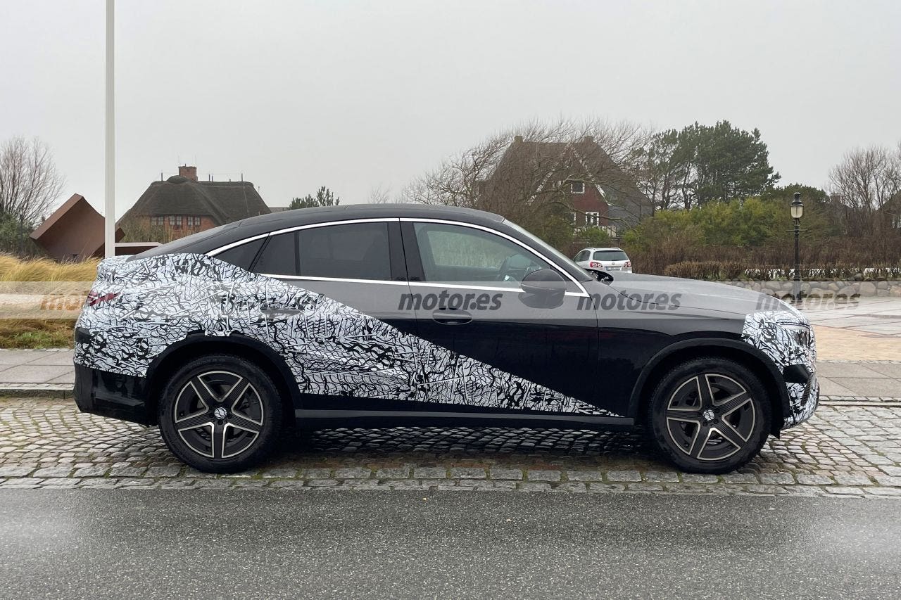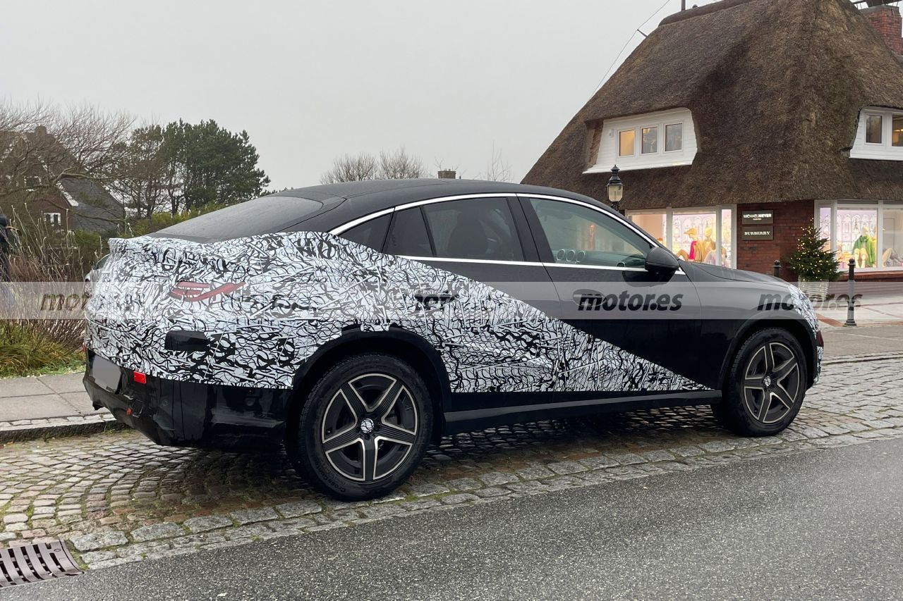 La vista laterale mostra la linea del tetto arcuata tipica dei SUV coupé, molto filante nella parte posteriore, che, nonostante la maggiore lunghezza, ha proporzioni equilibrate ma più da coupé. Ma in casa Mercedes sono riluttanti a scoprire la parte posteriore, che ha ancora un ottimo camuffamento e impedisce ai fanali di essere visti chiaramente. Saranno di certo più sottili e presenteranno una nuova firma luminosa. Sopra, uno spoiler discreto aggiunge una nota sportiva a un posteriore elegante.