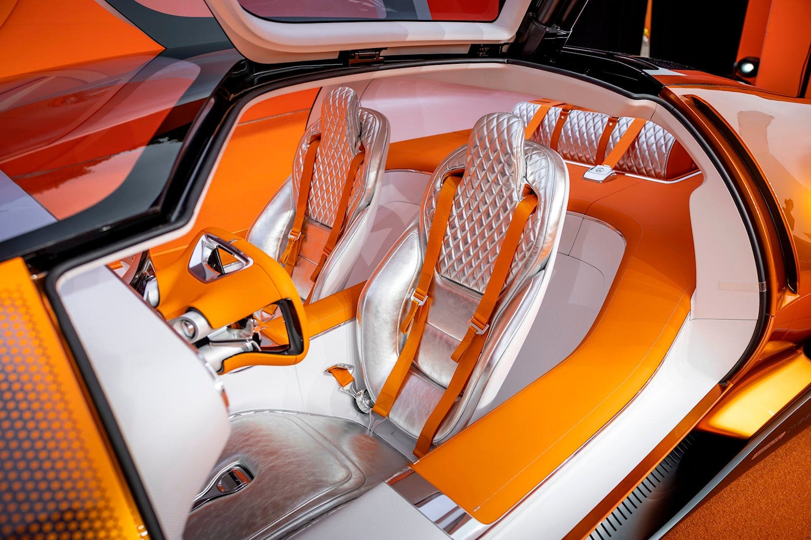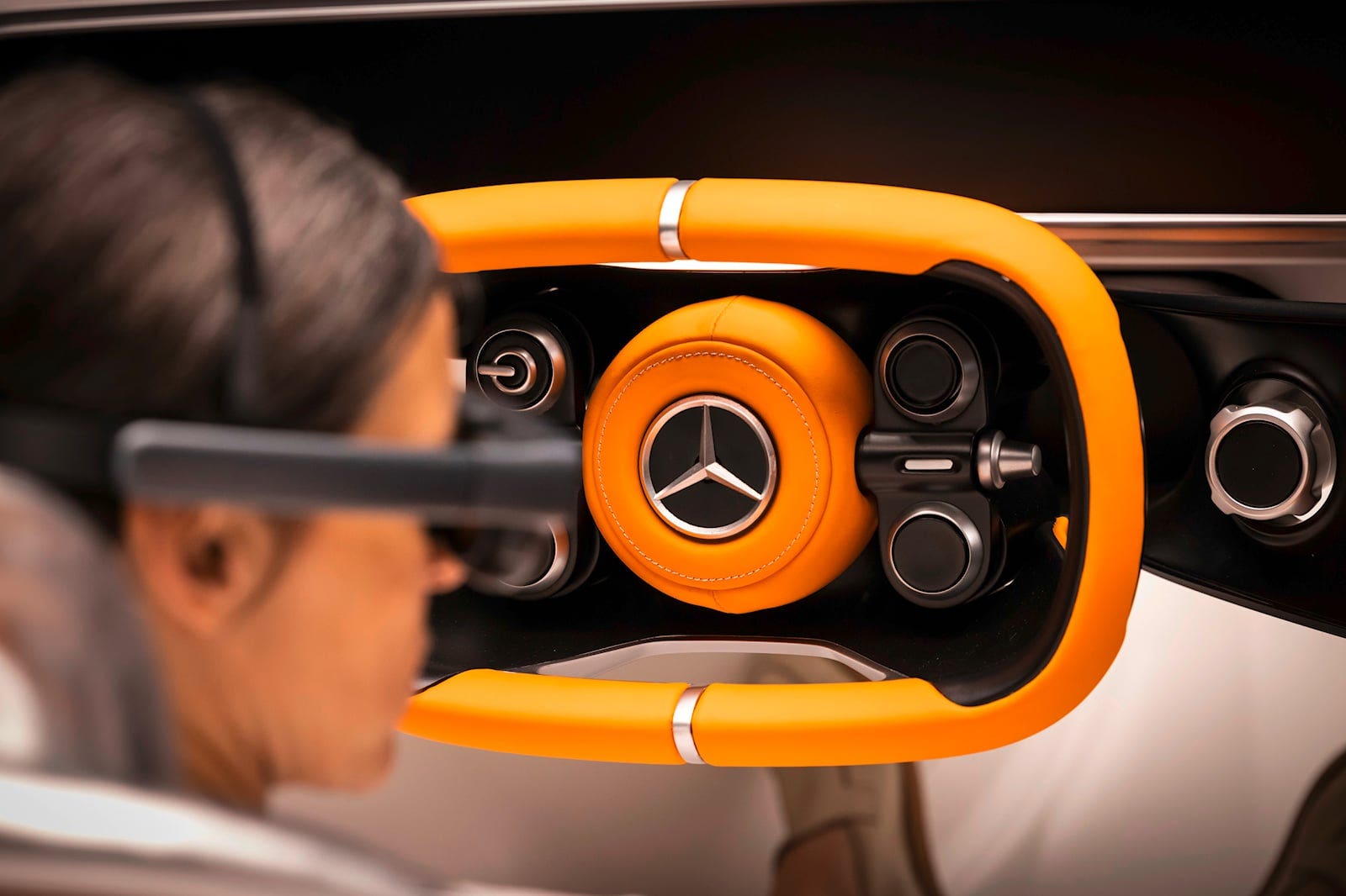 Mercedes ha mantenuto le prese d’aria inferiori che fiancheggiano la famosa stella del costruttore, incastonata in modo piuttosto prominente sotto le prese d’aria nere contrastanti sul cofano. La parte posteriore ha un display digitale con luci di stop pixelate e due diffusori prominenti. Mercedes ha anche illuminato le parti interne delle ruote, quindi i LED blu sono visibili dalla parte posteriore.