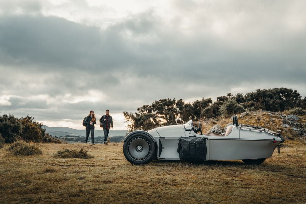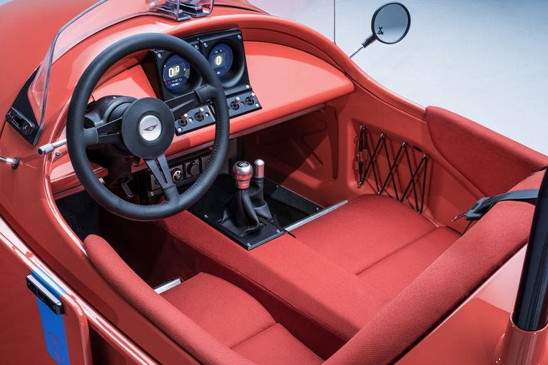 L’abitacolo minimalista è progettato per essere completamente resistente alle intemperie; Morgan dice che è possibile pulire l’interno con un lavaggio a getto. I quadri e i doppi display digitali rotondi al centro del cruscotto soddisfano tutti lo standard internazionale IP4 per la resistenza alla polvere e all’acqua. I sedili sono fissi, ma la pedaliera si muove per conducenti di dimensioni diverse. La scelta del materiale includerà vinile, cuoio e tessuto resistente “adventure spec”. Gli acquirenti potranno scegliere tra un’ampia gamma di colori e, come con la vecchia 3 Wheeler, alcuni pacchetti grafici di grande impatto visivo.