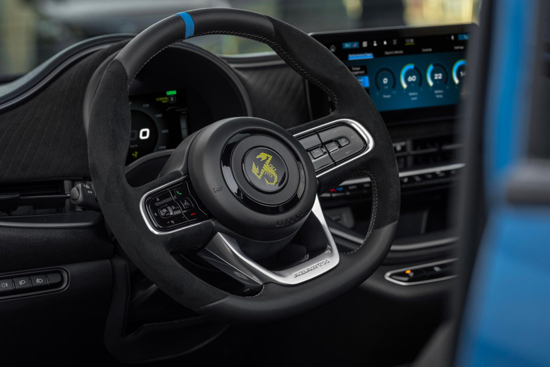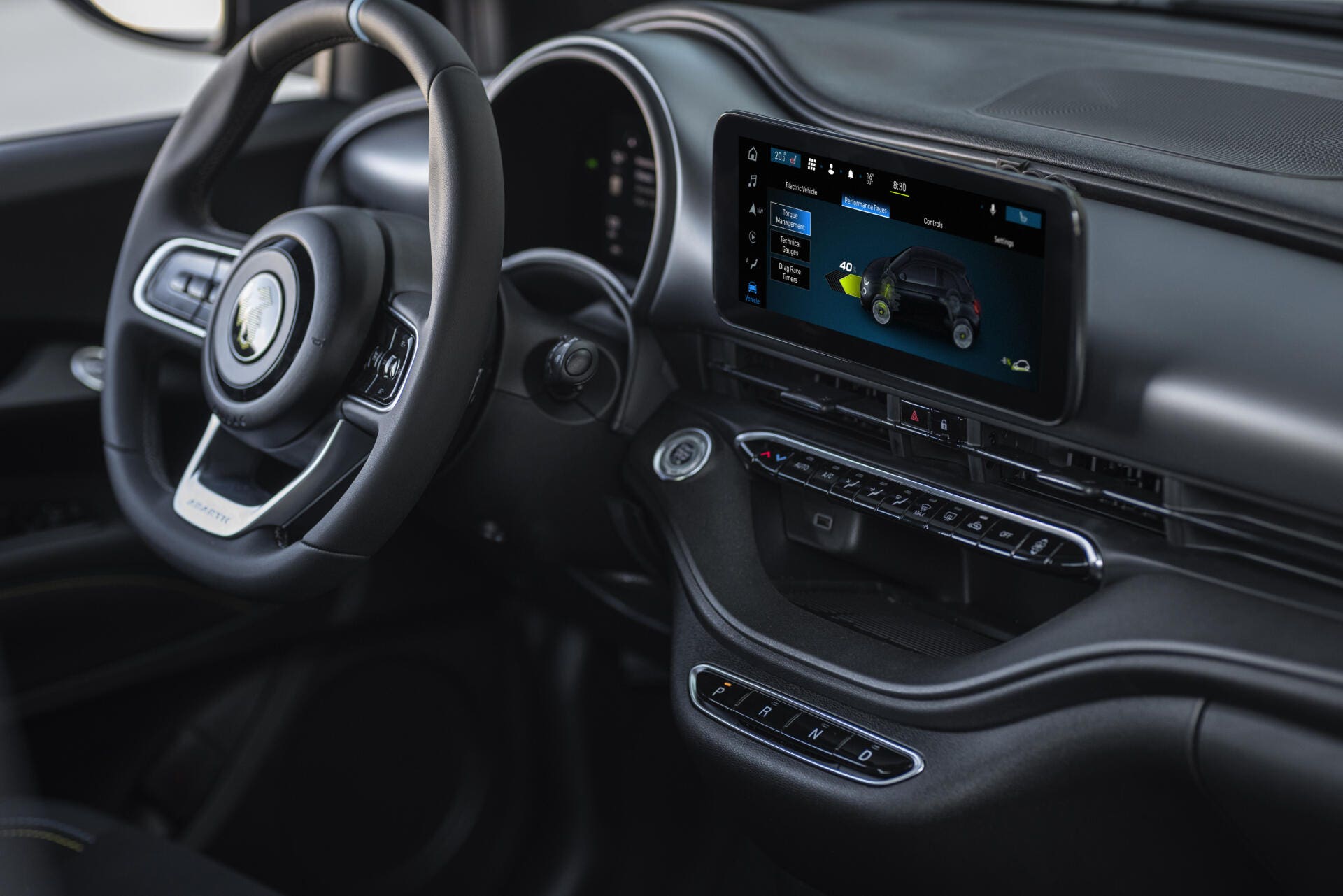 La sportività della nuova Abarth 500e trova la sua massima espressione anche all’interno dell’abitacolo dove troviamo un’atmosfera dark proveniente dai montanti e dal cielo, gli immancabili sedili sportivi con le “strisce dello scorpione” impresse sul tessuto, le doppie cuciture sportive e il volante rivestito in materiale soft-touch che rendono il posto guida il più sportivo e confortevole del Segmento di riferimento. Davanti al guidatore ci sono 2 schermi: di serie c’è un ampio schermo da 10,25 pollici destinato al sistema di infotainment con radio NAV Uconnect e nuove Performance Pages oltre al quadro strumenti con schermo TFT da 7 pollici con grafica dedicata Abarth. Le Performance Pages sono state studiate appositamente per la nuova Abarth elettrica e consentono ai clienti di tenere traccia delle proprie prestazioni alla guida della nuova 500e di casa Abarth.