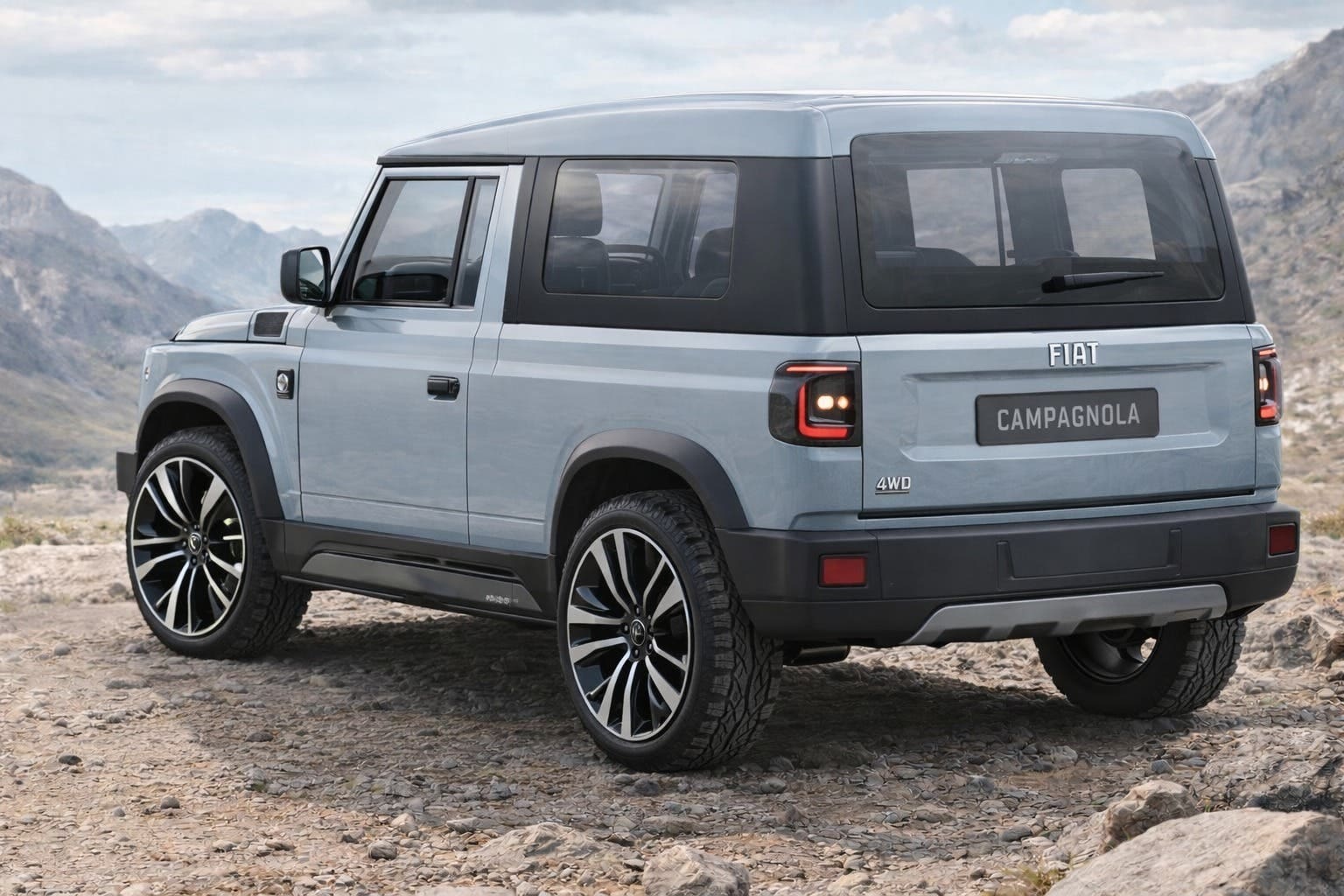 Il posteriore mantiene linee pulite e verticali, con gruppi ottici LED dal disegno squadrato e firma tridimensionale. Sul portellone ampio campeggia la scritta FIAT centrale insieme al badge 4WD, richiamo alla trazione integrale. Il paraurti è robusto e l’assetto rialzato, due dettagli che ribadiscono la vocazione off-road del progetto e lo ancorano alla tradizione della Campagnola originale.