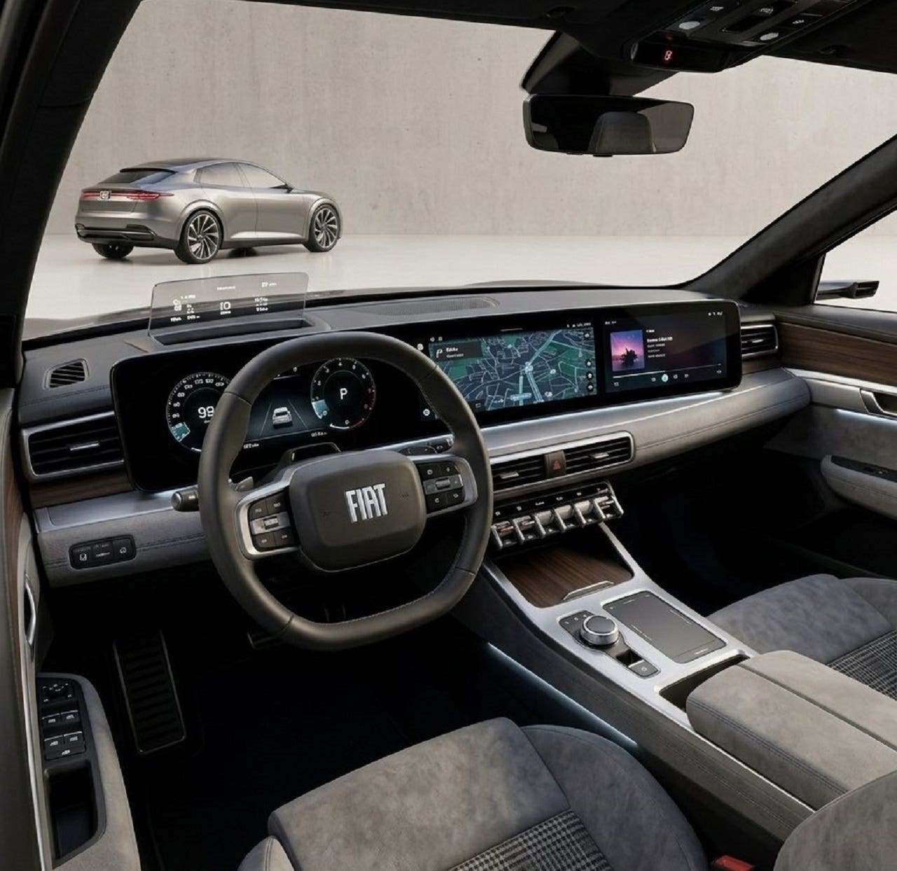 La nuova Fiat Croma, reinterpretata nel render di Francesco Flavio Bios, appare come una fastback moderna dal carattere elegante e tecnologico. Le linee sono pulite, tese e molto fluide, con una silhouette slanciata che unisce proporzioni da berlina rialzata e richiami crossover. Il frontale è dominato da una firma luminosa sottile e orizzontale, integrata in una mascherina chiusa che valorizza il logo FIAT, suggerendo un’anima elettrificata. I passaruota muscolosi e i grandi cerchi enfatizzano presenza e dinamismo, mentre il posteriore rastremato contribuisce a un’immagine sofisticata. Nel complesso trasmette innovazione, sobrietà e una forte identità italiana.