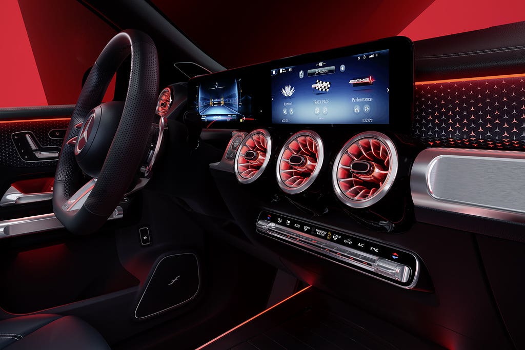 Uno dei punti salienti degli interni della nuova Mercedes GLB, come nel caso della nuova Mercedes GLA, è dovuto al significativo aggiornamento con doppio schermo indipendente. Nella variante standard sono disponibili un display da 7 pollici e da 10,25 pollici per i rispettivi schermi dei cluster di strumenti e multimedia, con due display a schermo largo da 10,25 pollici disponibili come opzione. Le bocchette dell’aria rotonde trasmettono maggiore sportività ed eleganza e contrastano con gli altri elementi in alluminio. Il volante standard dell’attuale generazione è rivestito in pelle, con la pelle artificiale ARTICO disponibile su richiesta mentre, per la prima volta, si può avere la corona del volante riscaldata nel caso dell’allestimento AMG.