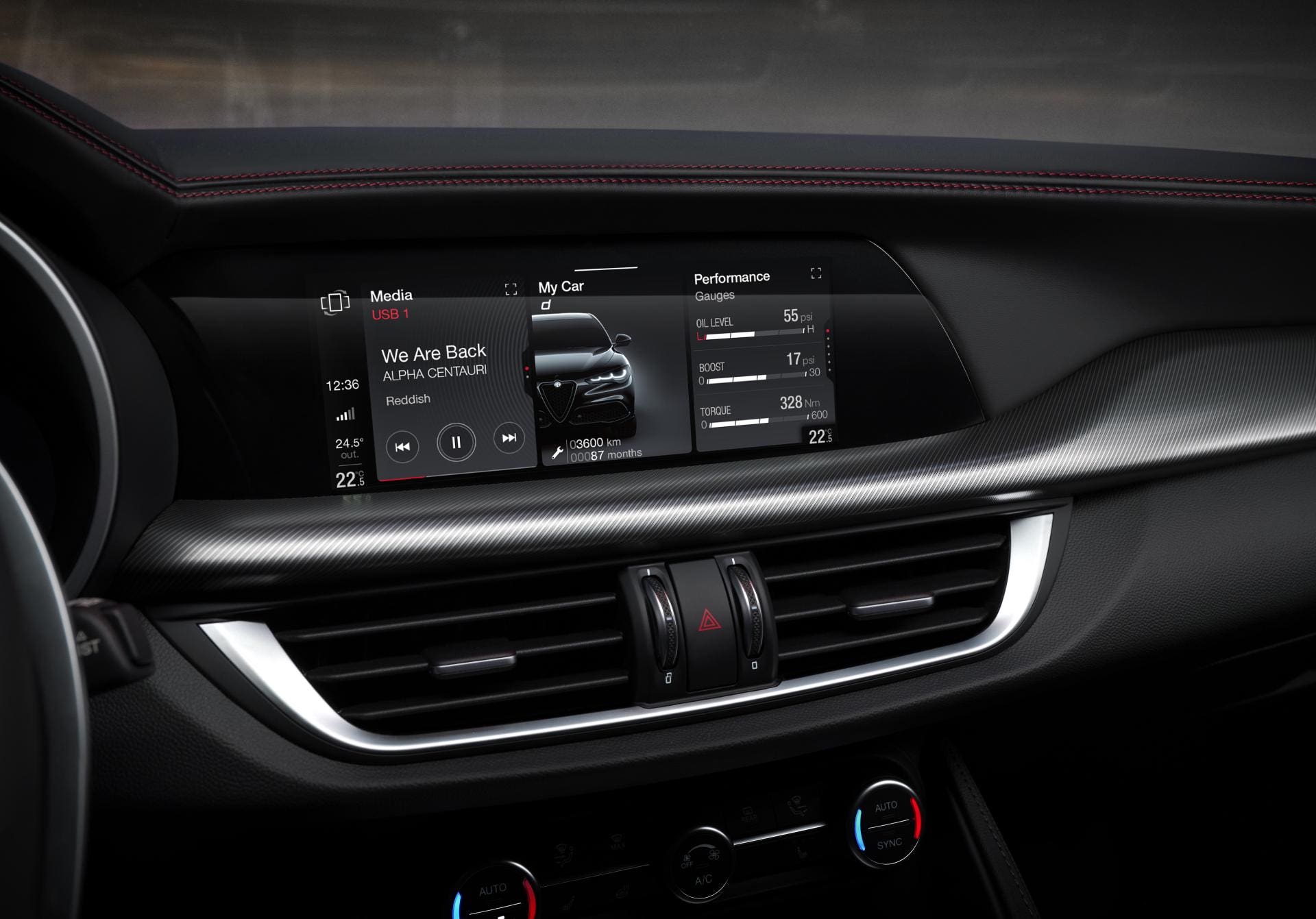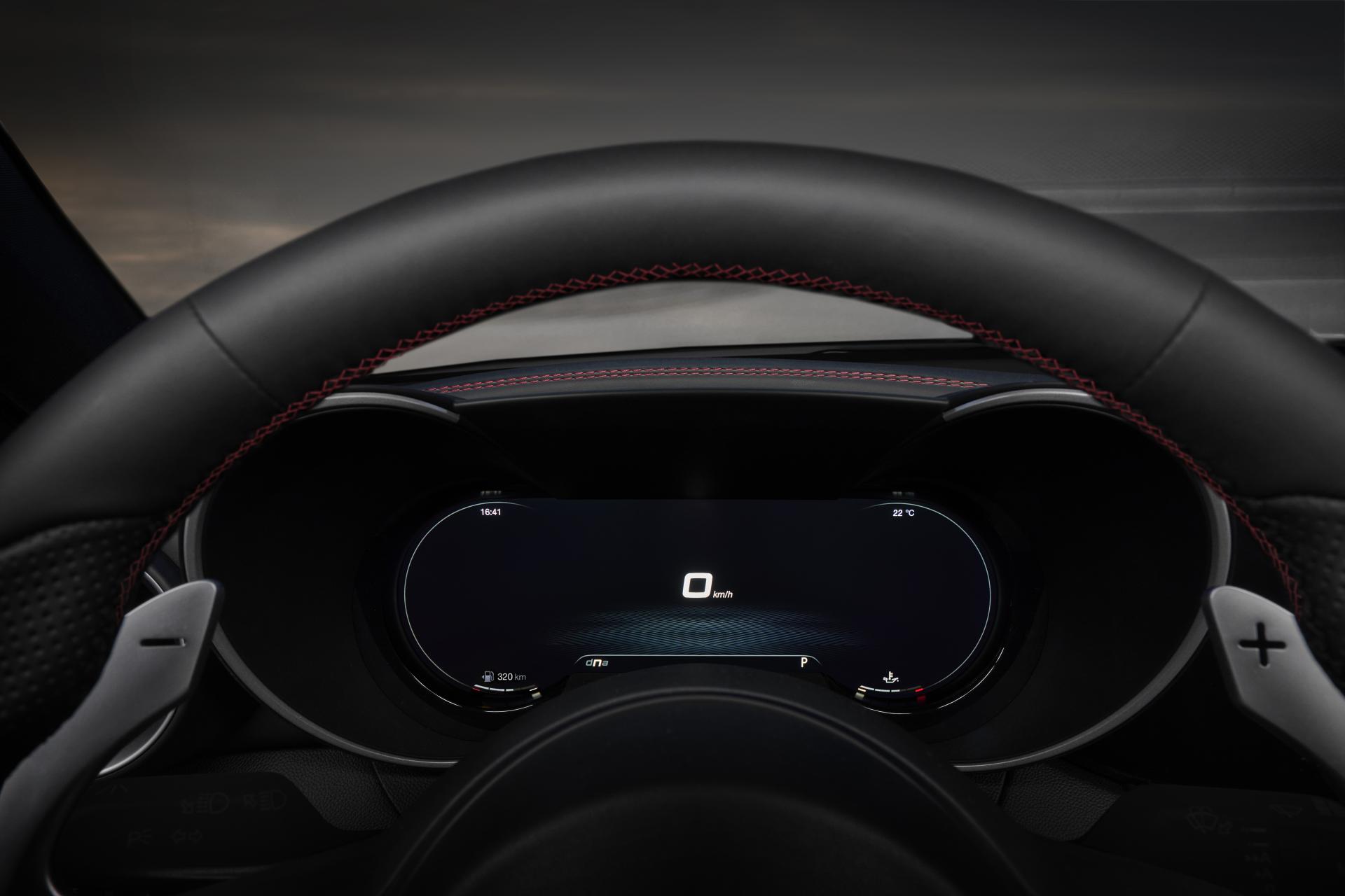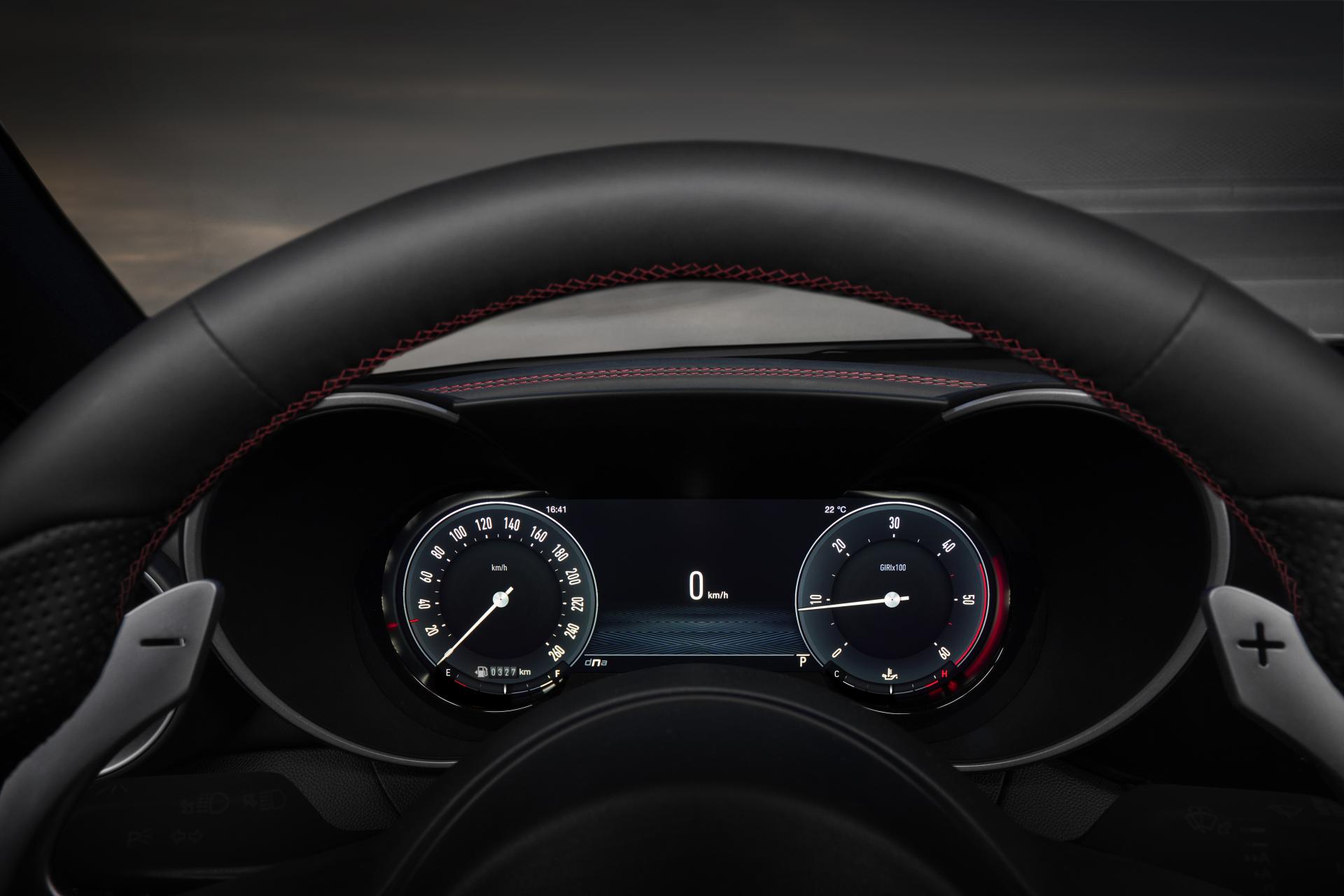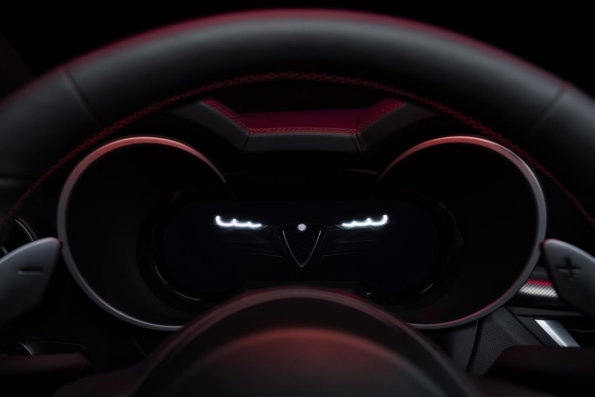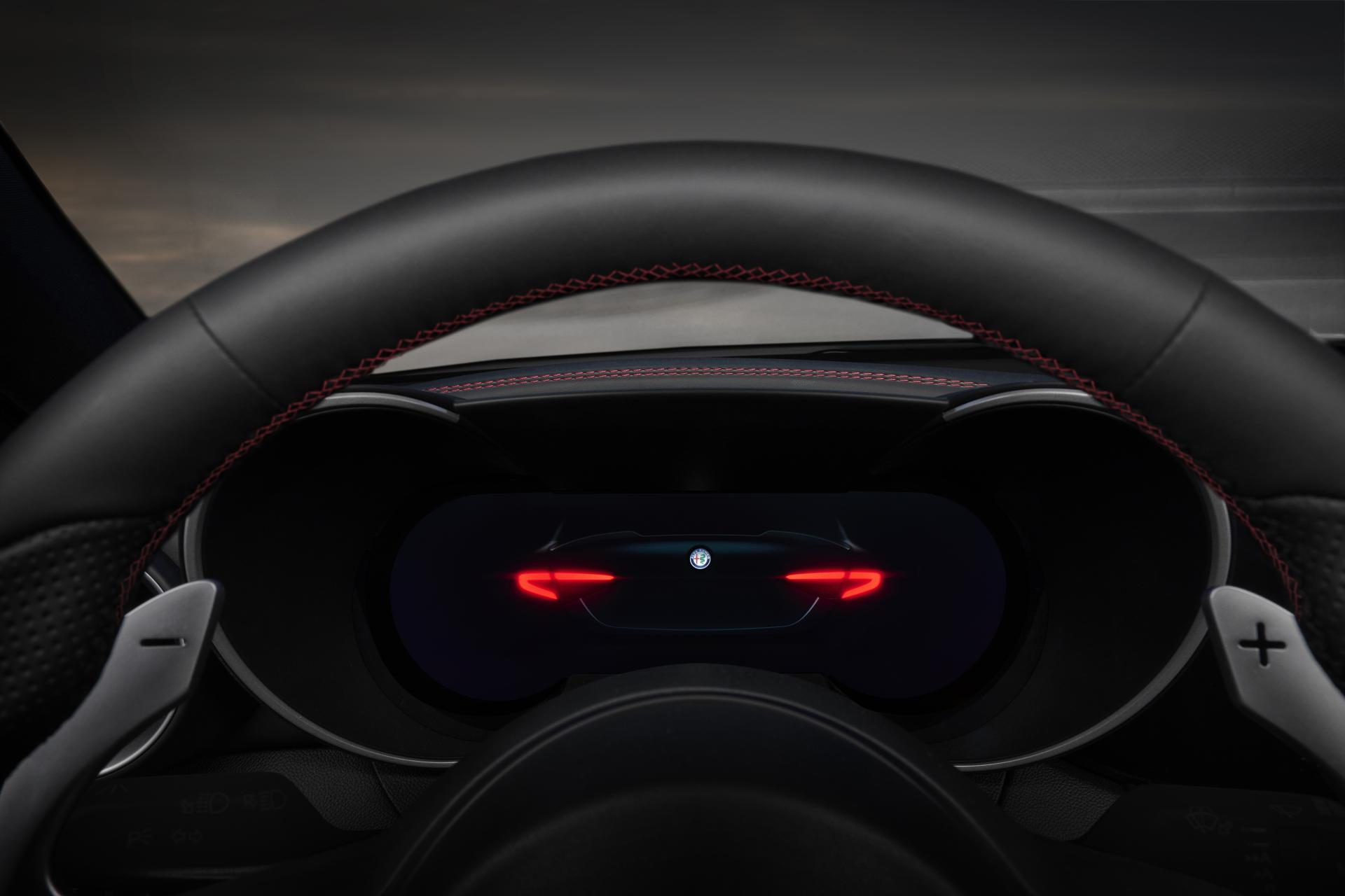 Lo schermo è un’unità TFT da 12,3 pollici dal quale è possibile accedere ad ogni informazione utile a permettere il corretto funzionamento della vettura e a gestire le molteplici tecnologie legate alla guida autonoma. Si possono scegliere tre differenti layout: Evolved, che rappresenta la visione progettuale delle Alfa Romeo del futuro valorizzando l’area centrale dello schermo pur mantenendone i 2 quadranti laterali; Relax, con un focus specifico sul comfort, libero da dettagliate informazioni vettura e caratterizzato dall’ assenza dei 2 quadranti; Heritage, che si ispira ai modelli iconici del marchio degli Anni ’60 e ’70, con dettagli distintivi come i numeri invertiti sull’estremità finale del tachimetro.
