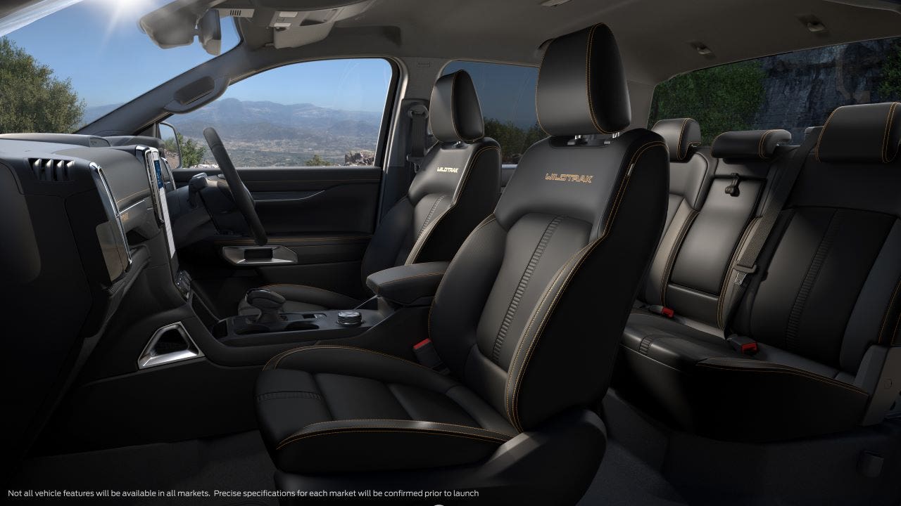 Infine sono nuovi il volante, il selettore del cambio e i rivestimenti dei sedili in pelle: pare evidente il salto di qualità in termini di qualità rispetto alla precedente generazione. Il Ford Ranger adotterà il nuovo turbodiesel V6 da 3 litri o un 4 cilindri, sempre diesel, da 2 litri con uno o due turbocompressori. La variante a benzina è invece quella destinataria dell’EcoBoost da 2,3 litri che è lo stesso già visto sui Ford Bronco e Mustang. Sono invece tre i cambi a disposizione: il manuale a 6 rapporti e due automatici a 6 o 10 rapporti. La trazione integrale prevede due sistemi: uno inseribile e uno con trazione sulle quattro ruote permanente.