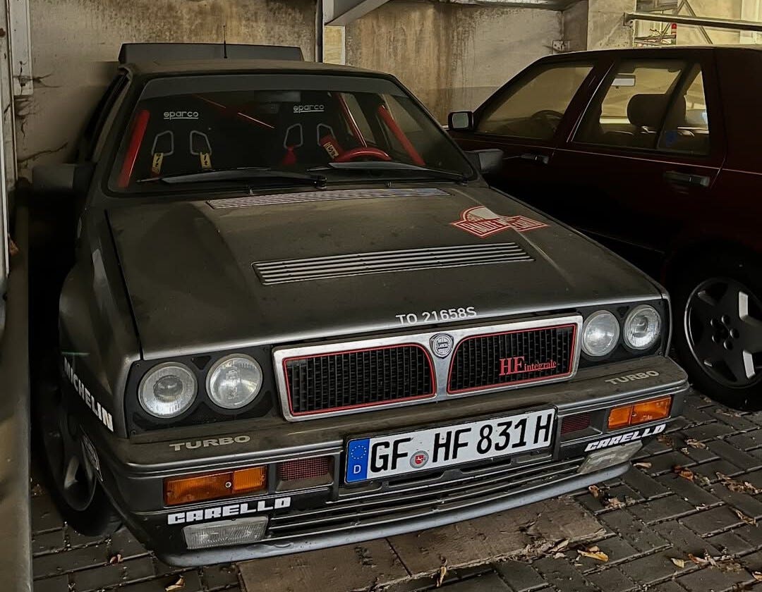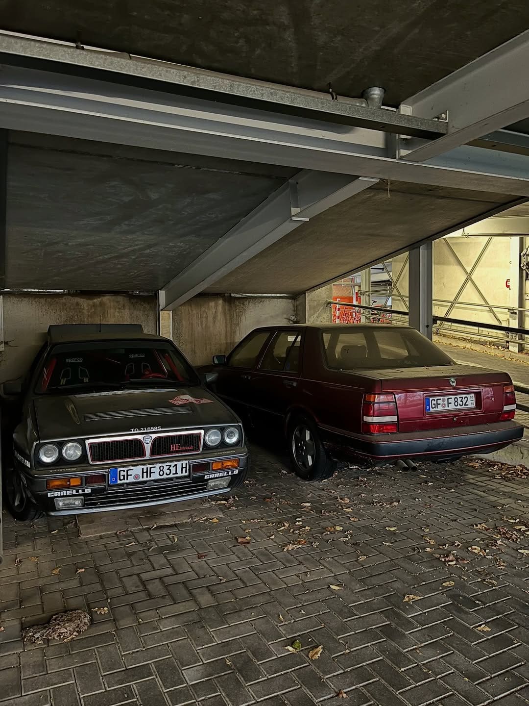 È il momento di farsi ammaliare dall’immaginazione. Ecco che stiamo percorrendo le scale per scendere nel parcheggio sotterraneo di un grigio centro direzionale tedesco, convinti di trovare la solita sfilata di berline d’ordinanza. Di colpo, però, la sorpresa più bella, specie se si è appassionati di auto italiane, di simboli della storia dell’automobilismo tricolore. Quello ritrovato in questo luogo polveroso è niente di meno che il paradiso perduto del motorismo italiano. Eccole, dunque, due leggende viventi, una Lancia Delta Integrale HF e una Lancia Thema 8.32.