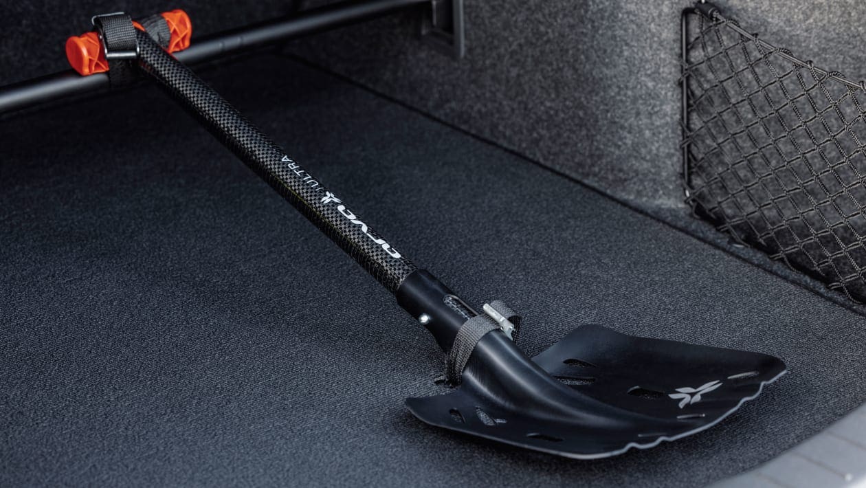 All’interno, Polestar 2 ha montato un paio di sedili avvolgenti Recaro rifiniti in fibra di carbonio e inserti dorati, mentre trasporta anche una pala da neve in fibra di carbonio e una cinghia per il recupero nel caso in cui il conducente si allontani dai sentieri battuti.