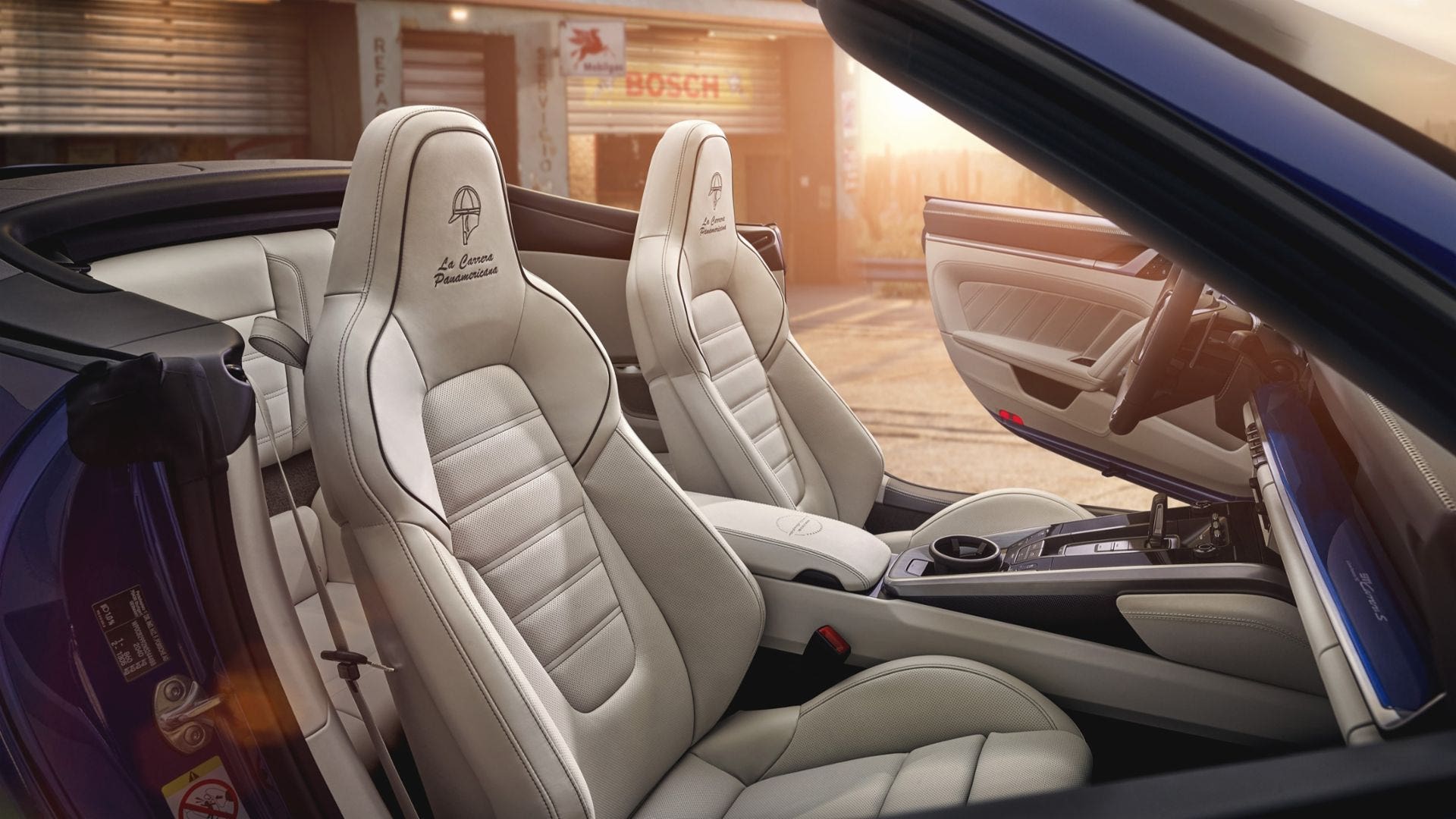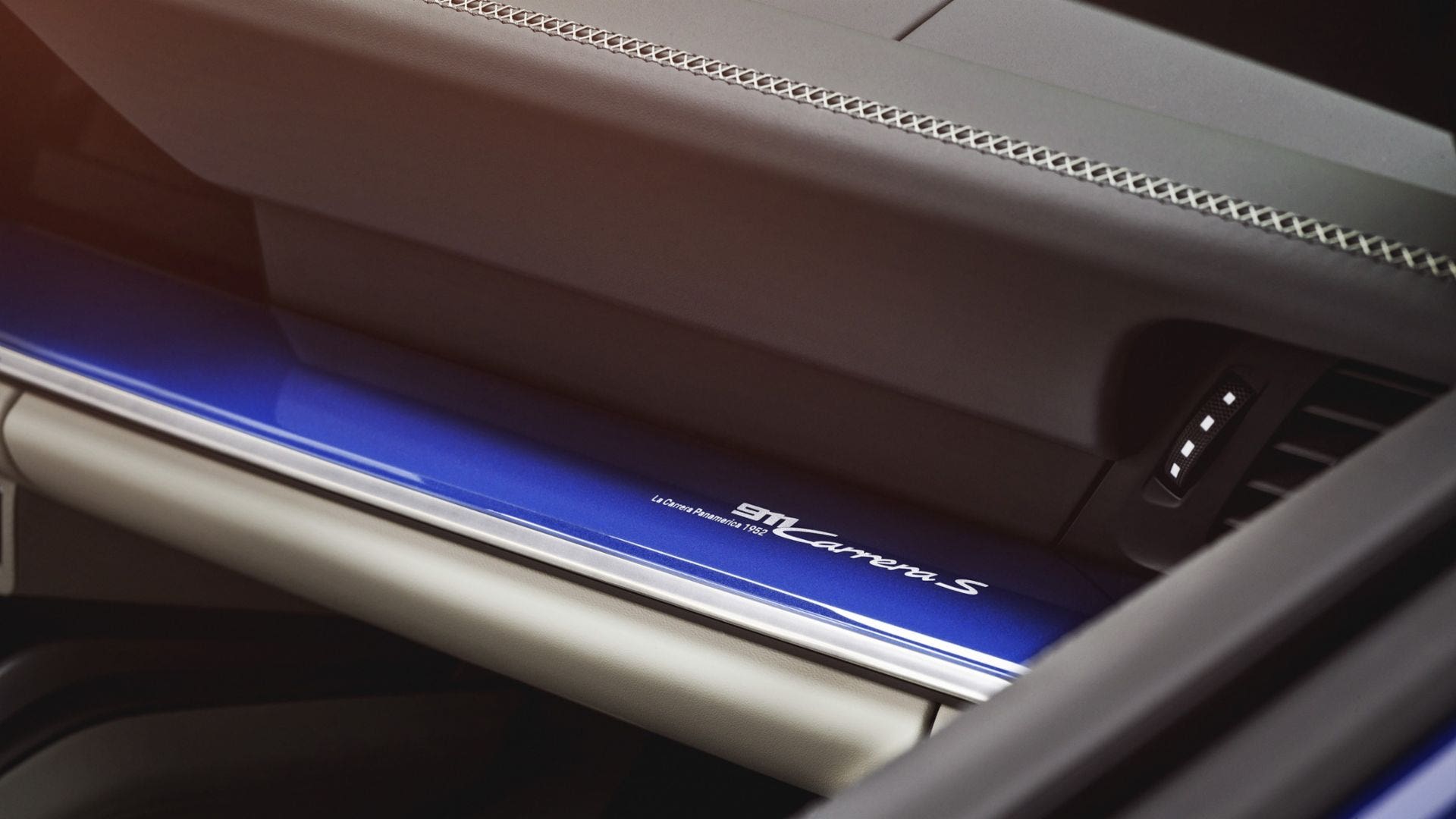 Sul lato destro del cruscotto compare la scritta “911 Carrera S – La Carrera Panamericana 1952”, mentre sul bracciolo centrale compare il logo Porsche Exclusive Manufaktur in blu grafite.