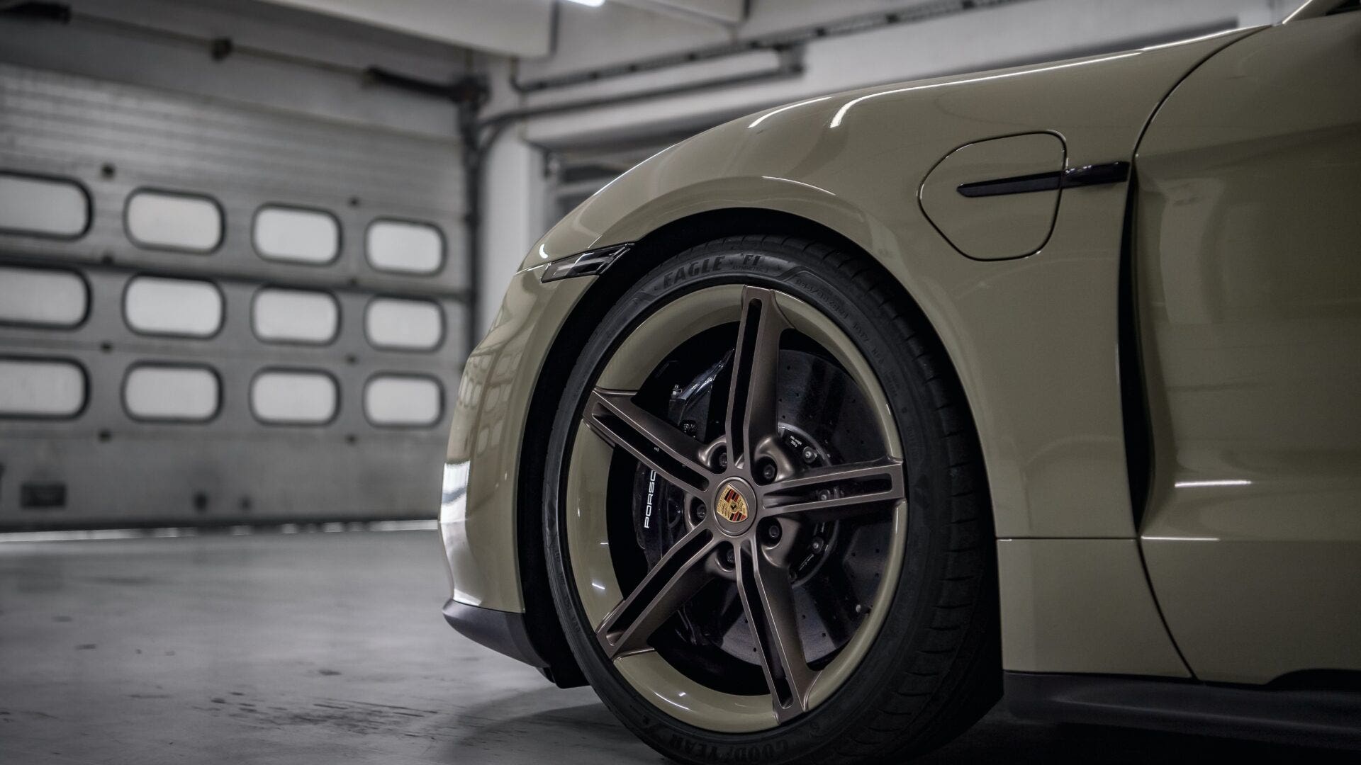 Un altro elemento che attira l’attenzione sono i nuovi cerchi ruota Mission E Design da 21 pollici di diametro. Le razze sono verniciate in bronzite satinato, mentre il bordo esterno del cerchio è rifinito nello stesso Grigio Pietra lucido visto già per gli esterni. Le verniciature satinate e lucide sono state applicate insieme sul cerchio. Questa combinazione rende la vettura ancora più esclusiva. In abbinamento con le razze, il coprimozzo con fregio è verniciato in bronzite satinato e presenta il classico logo Porsche a colori. Le pinze dei freni sono verniciate in nero lucido.