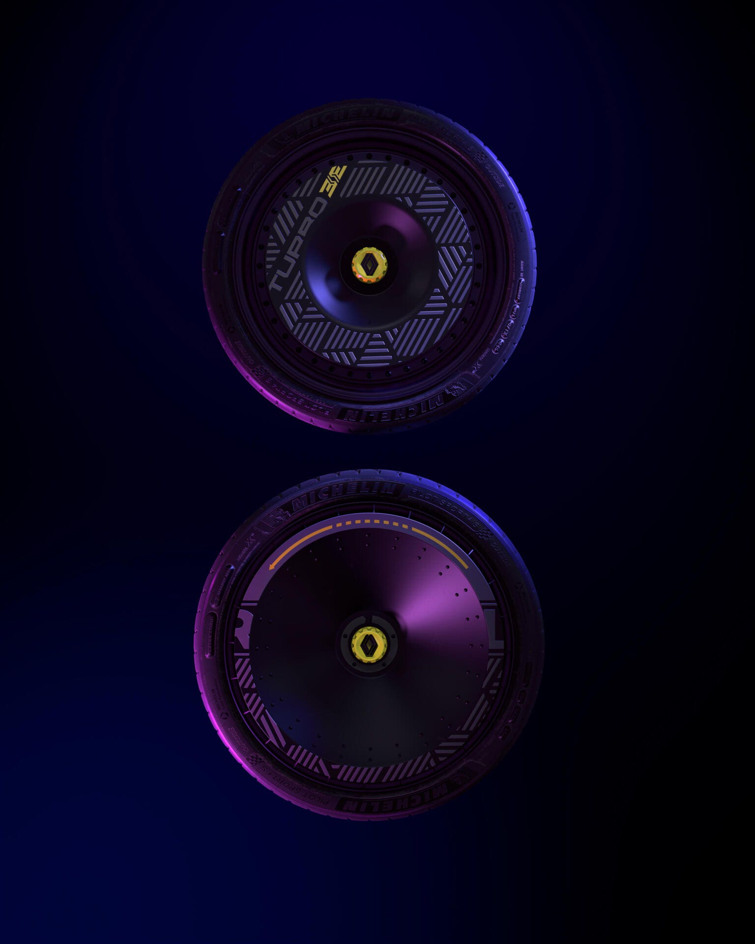 Sulle orme della progenitrice, la R5 Turbo 3E ha quattro fendinebbia quadrati a LED. Per quel che riguarda ilposteriore sono mantenute le enormi dimensioni. La presa d’aria anteriore dà il benvenuto al suo interno alla presa di ricarica. I cerchi anteriori da 19 pollici montano pneumatici da 225×35, quelli posteriori da 20” hanno le gomme da 325×25. All’interno predomina uno stile minimalista, espresso dai sedili monoscocca in fibra di carbonio. Al posto del cockpit “vecchia generazione”, il prototipo ospita dieci display digitali. La grossa leva del freno a mano ne sottolinea la vocazione.