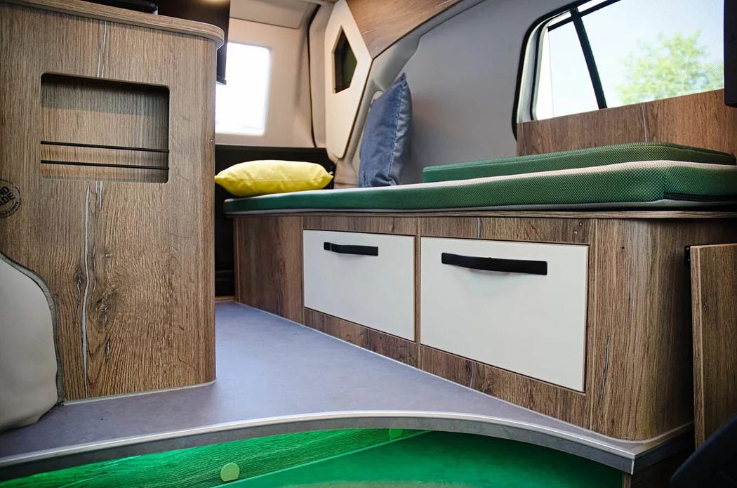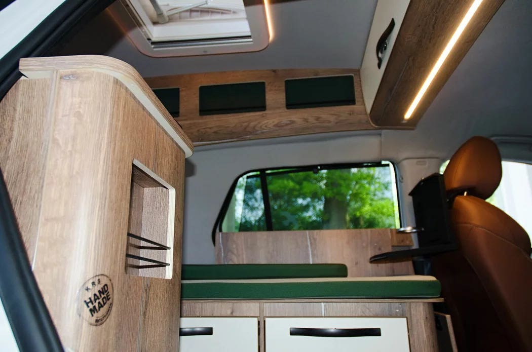 Una soluzione che aumenta l’abitabilità all’interno dell’abitacolo, che ora fa a meno dei sedili posteriori, sostituiti da mobili e vani portaoggetti nel volume in più fornito dal tetto disponendo anche di un lettino su una lunga panca laterale sul lato sinistro. Anche il tetto extra dispone dei classici lucernari da camper che permettono non solo di migliorare la qualità dell’aria interna ma anche di godere di ulteriore luce naturale.
